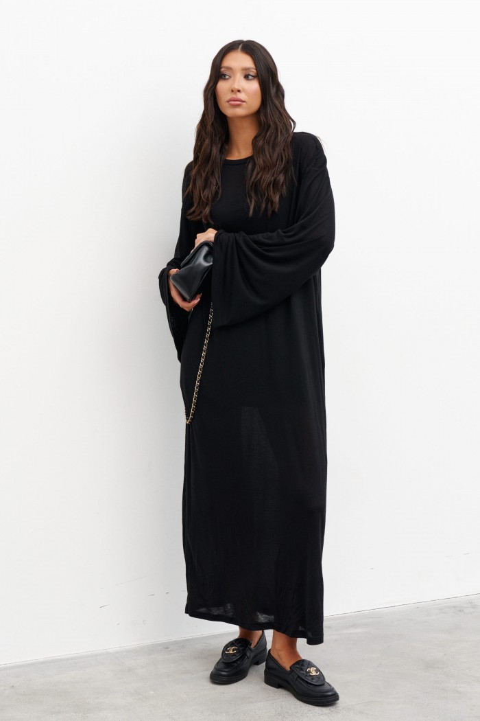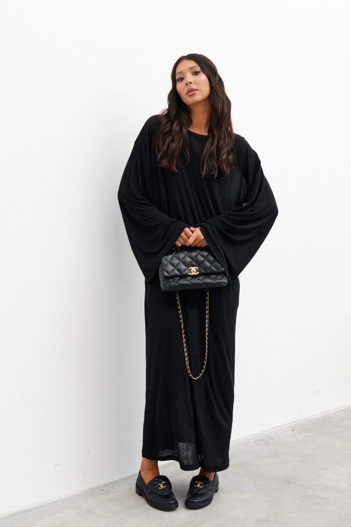 Комплект состоит из двух платьев: платье на бретелях и платье прямого свободного кроя. Выполнен из полупрозрачного трикотажного полотна белого цвета. Характеристики:нижнее платье полуприлегающего силуэта, А-образный силуэт, бретели - не регулируемые. Длина по спинке 65 см. Верхнее платье прямого свободного кроя, горловина овальная, рукав спущен. Длина по спинке от края горловины 131 см, длина рукава от края горловины 75 см.