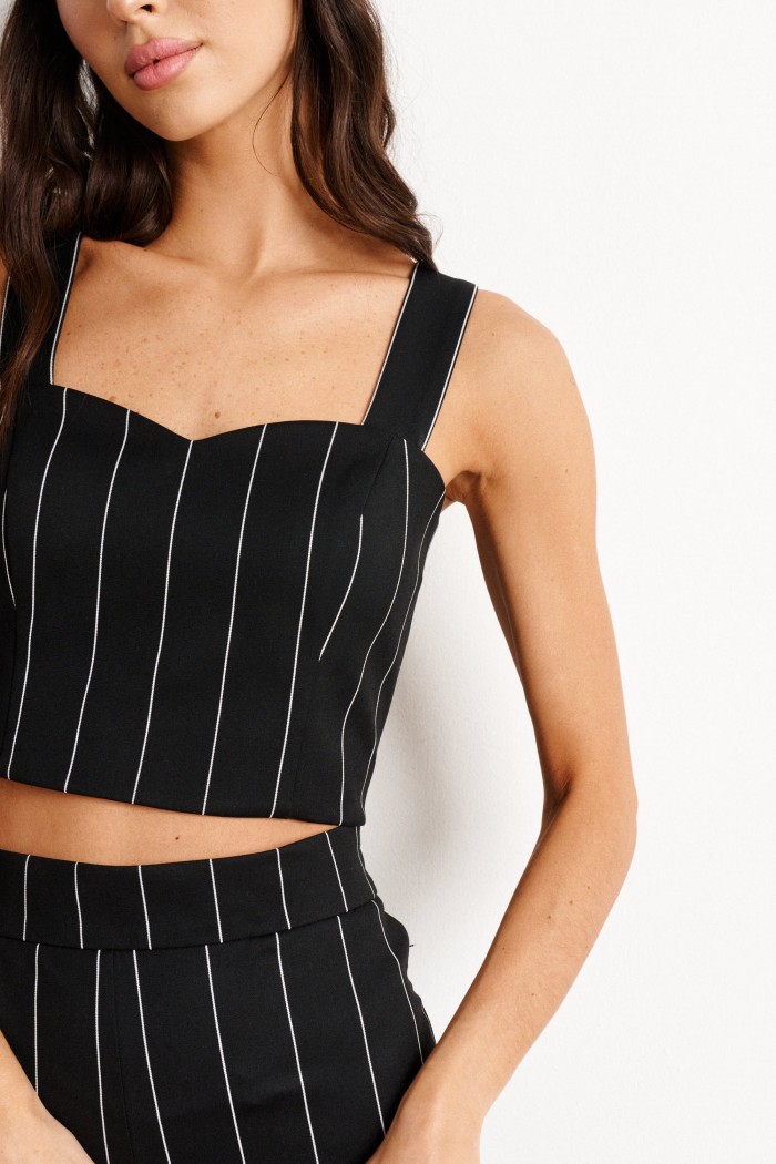 Топ на широких бретелях выполнен из черной ткани с вертикальными белыми полосками.