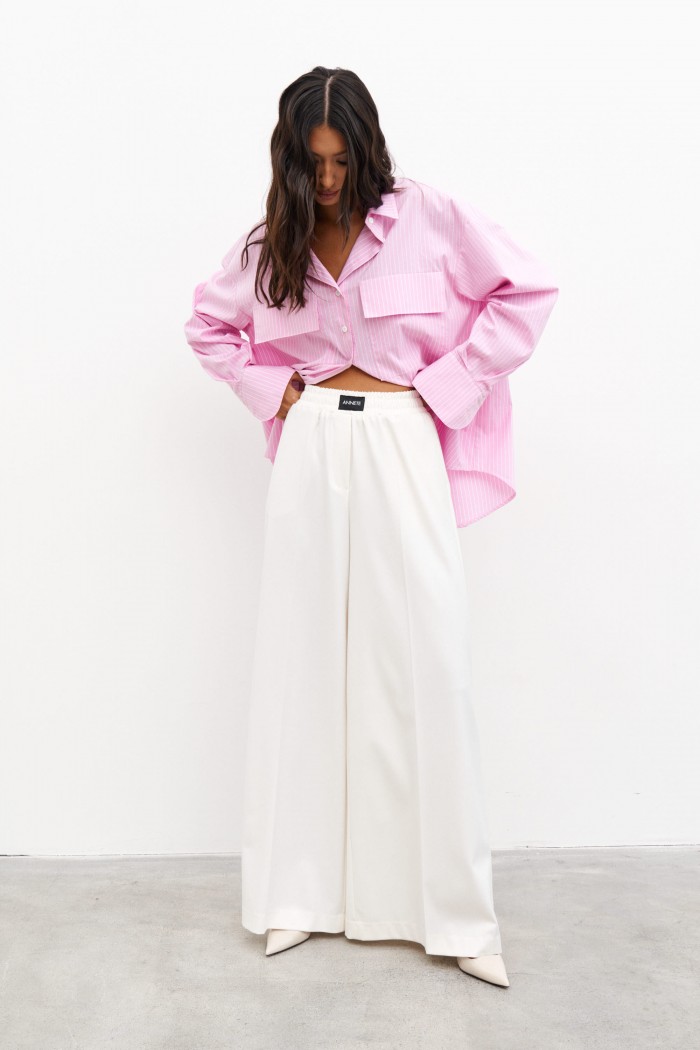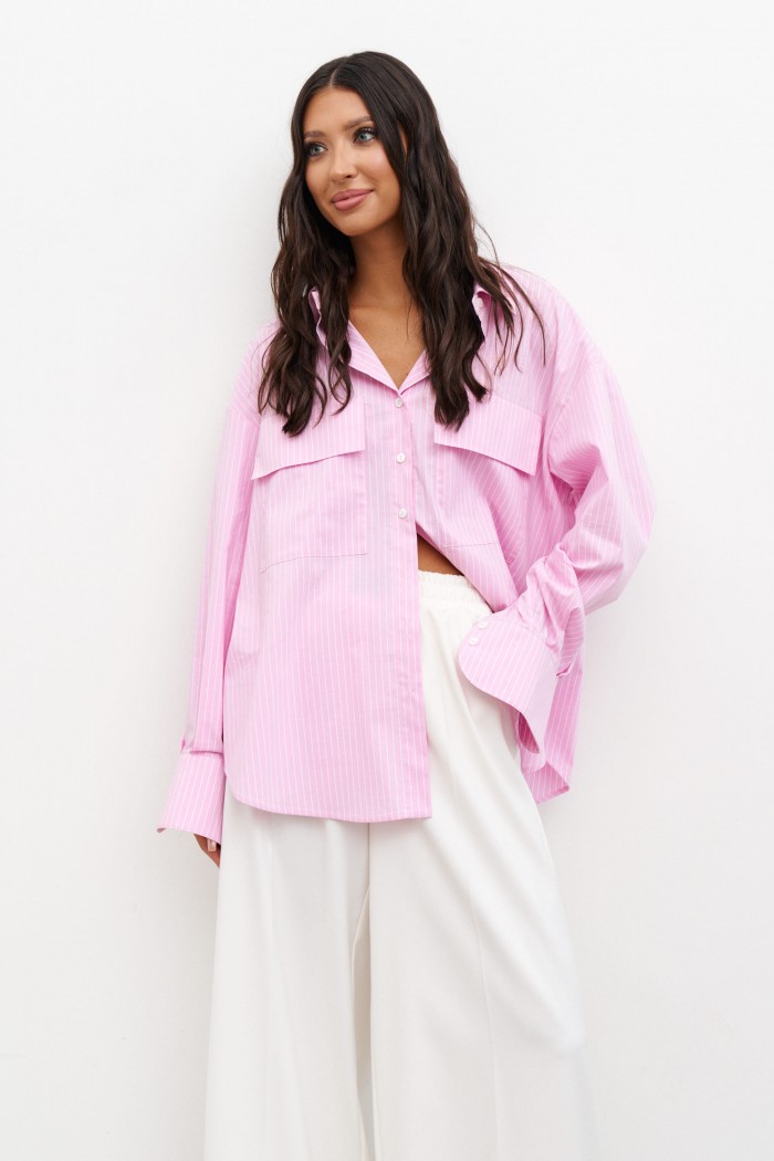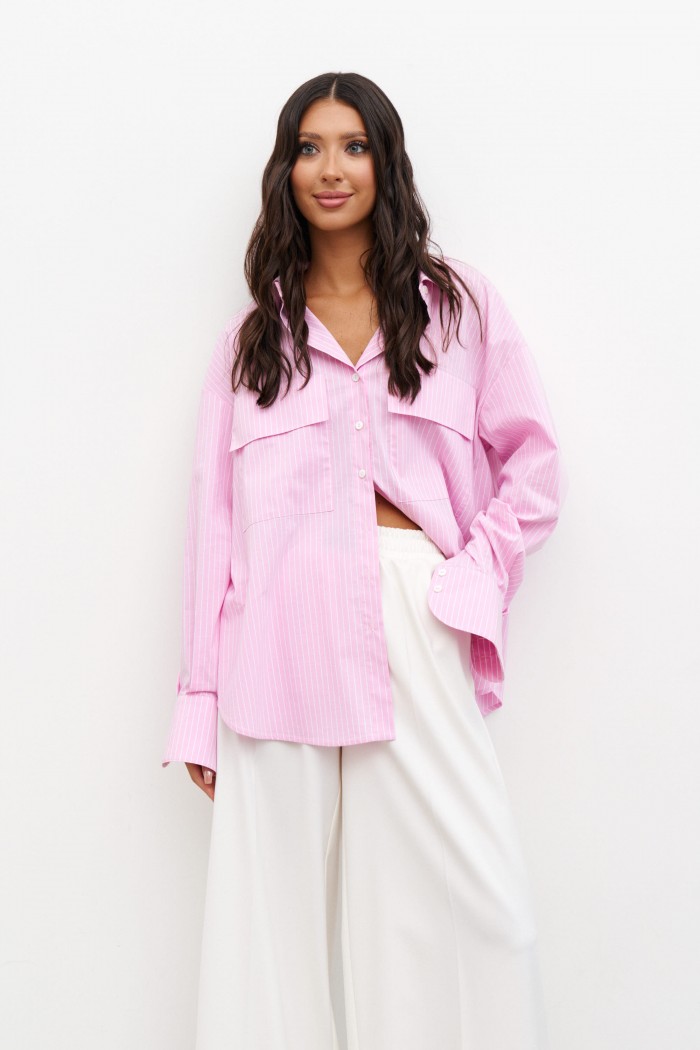 Рубашка прямого свободного кроя выполнена из розового полотна в белую полоску. Характеристики: прямой свободный крой, отложной воротник на стойке , застежка центральная на петли пуговицы, рукав спущен, по низу рукава манжета на пуговичках, по переду крупные накладные карманы, спинка отрезная с защипами, низ изделия с плавным срезом. Длина по спинке 77 см, дли на рукава от края горловины 78 см.