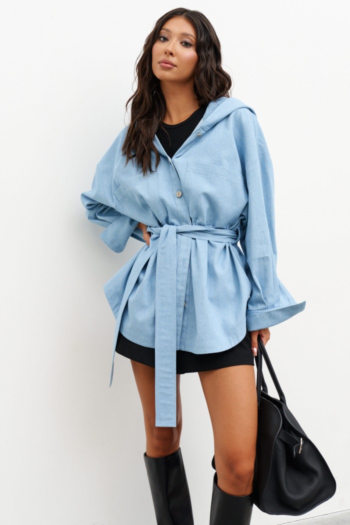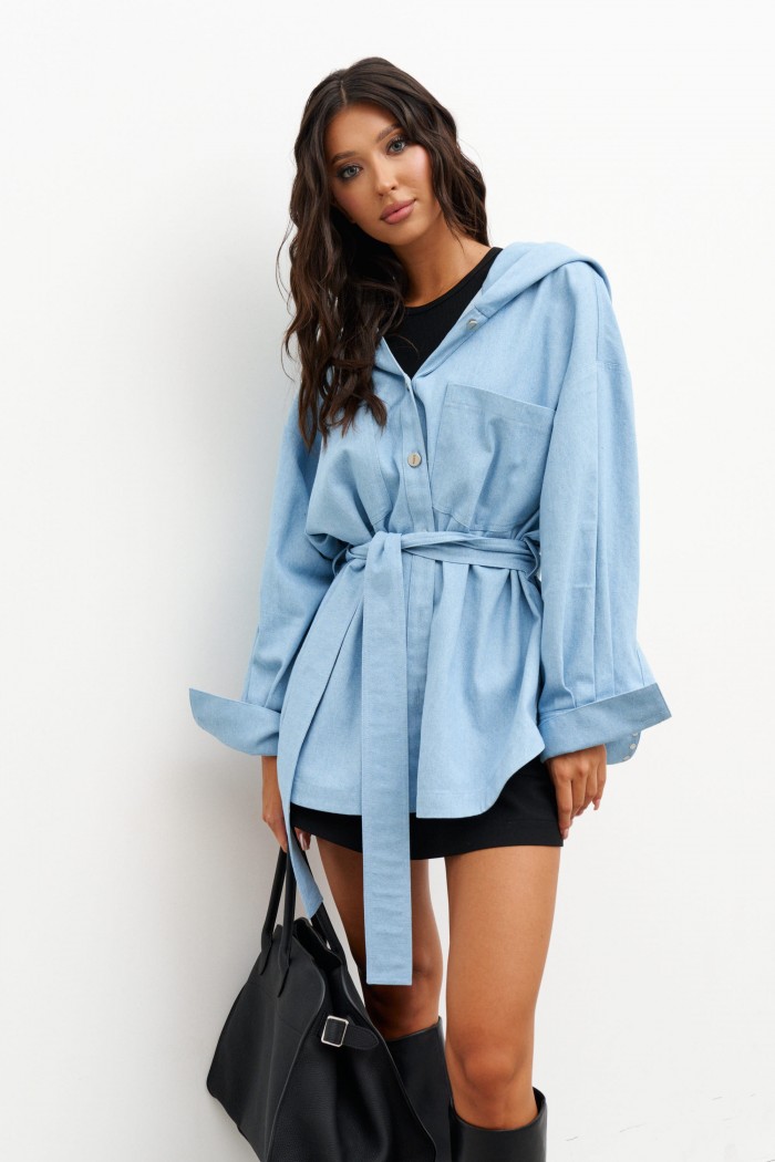 Блузон прямого свободного кроя. Выполнен из мягкого денима голубого цвета. Характеристики: прямой свободный крой, рукав спущеный, по линии талии шлевки, пояс в комплекте. Застёжка центральная на пуговицы, по переду изделия один накладной карман. Над манжетом защипы, манжет застёгивается на три пуговицы. Длина по спинке 75 см, длина рукава от края горловины 73 см.