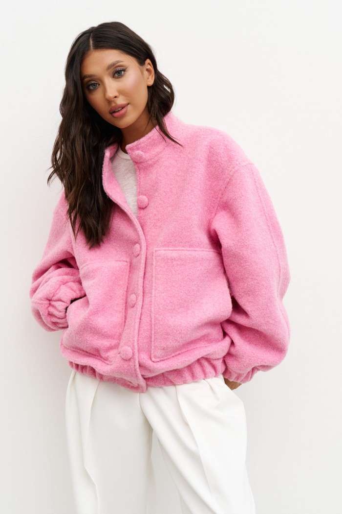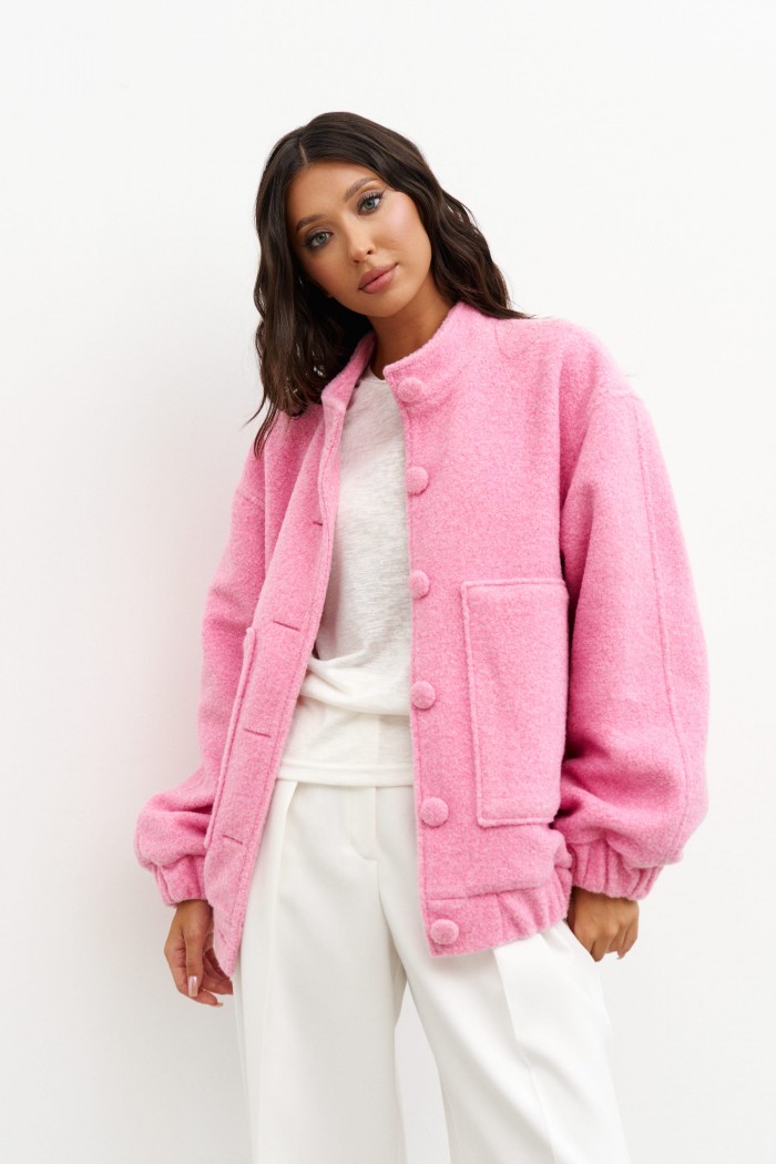 Бомбер выполнен из фактурного полотна розового цвета. Характеристики: воротник-стойка, застёжка центральная на петли пуговицы, пуговицы выполнены из основной ткани изделия, есть подкладка, по переду изделия имитация карманов, широкий спущеный рукав заканчивается манжетом-резинкой,по низу изделия резинка. Длина по спинке от края горловины 69 см, длина рукава от края горловины 79 см.