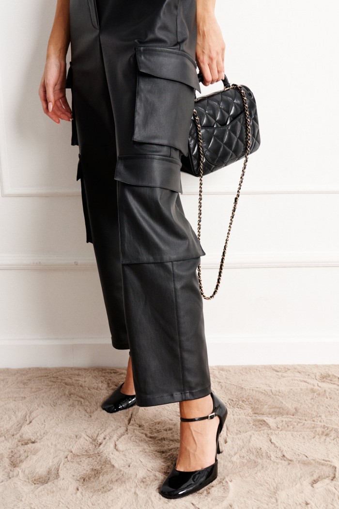 Брюки прямого кроя с акцентными карманами выполнены из искусственной кожи.