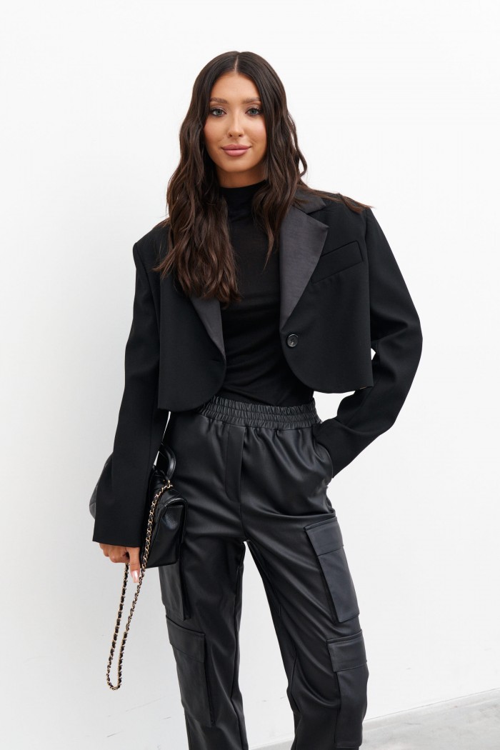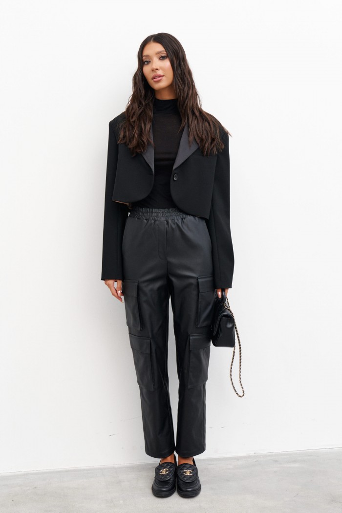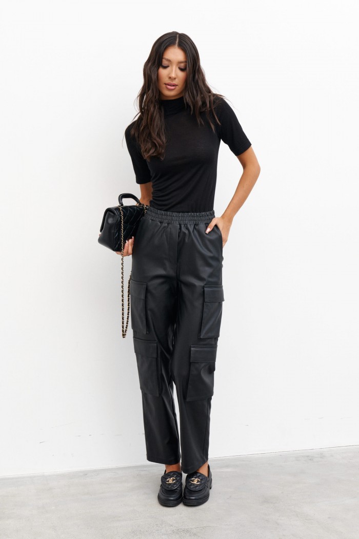 Брюки прямого кроя с акцентными карманами выполнены из искусственной кожи.