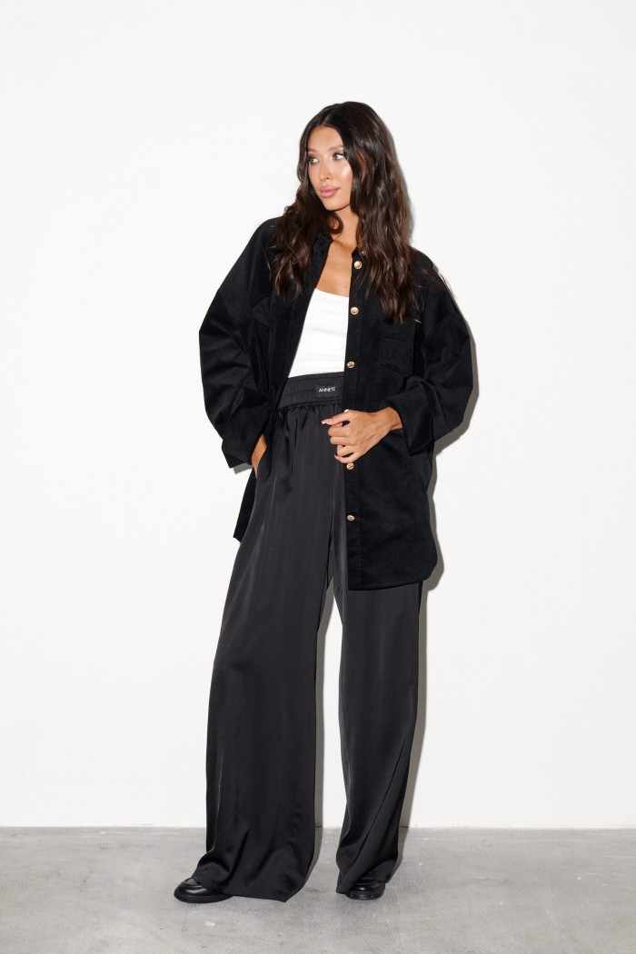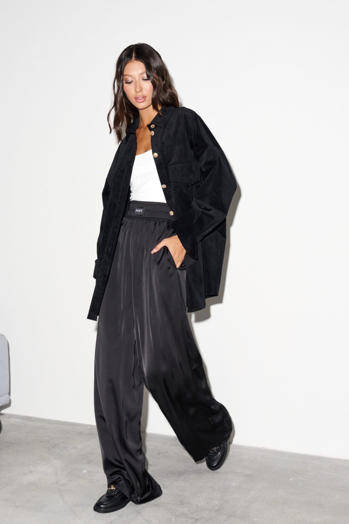 Брюки прямого свободного кроя выполнены из струящейся ткани черного цвета. Характеристики: прямой крой, эластичная резинка с брендированной нашивкой, боковые карманы, . Длина брюк по боковому шву 115 см