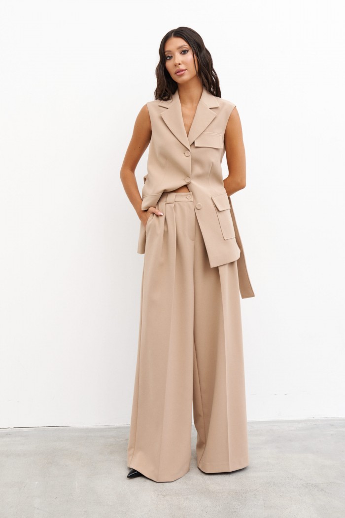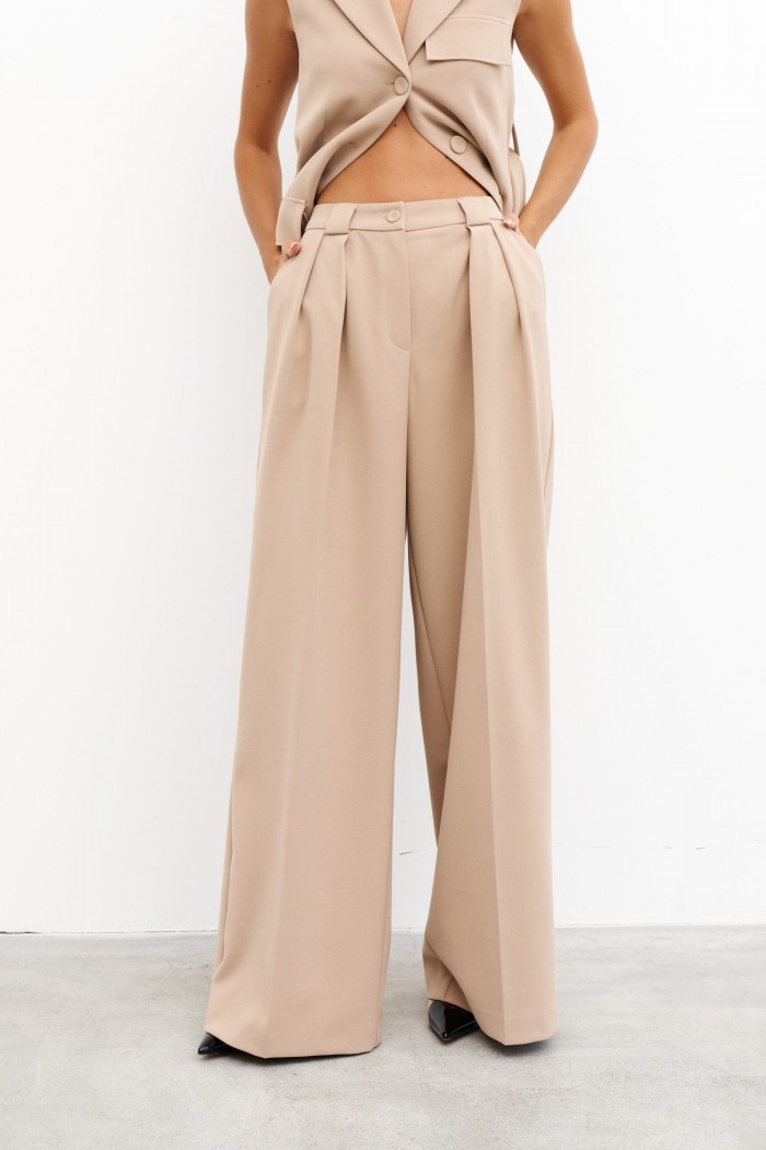 Брюки прямого свободного кроя выполнены из плотного полотна песочного цвета. Характеристики: прямой крой, пояс стабильный, по поясу нашиты широкие шлевки, декоративная сборка по передней части, заутюженные стрелки по переднему и заднему полотну брюк. Длина изделия 115 см.