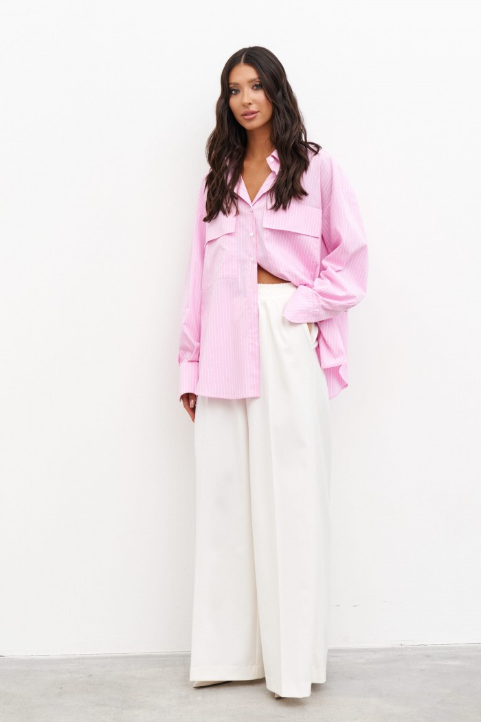 Брюки прямого свободного кроя выполнены из текстильного полотна белого цвета. Характеристики: прямой крой, пояс - брендированная резинка, по передней части изделия декоративные складки, по передней и задней части брюк заутюженные стрелки, в боковых швах карманы. Длина 112 см.