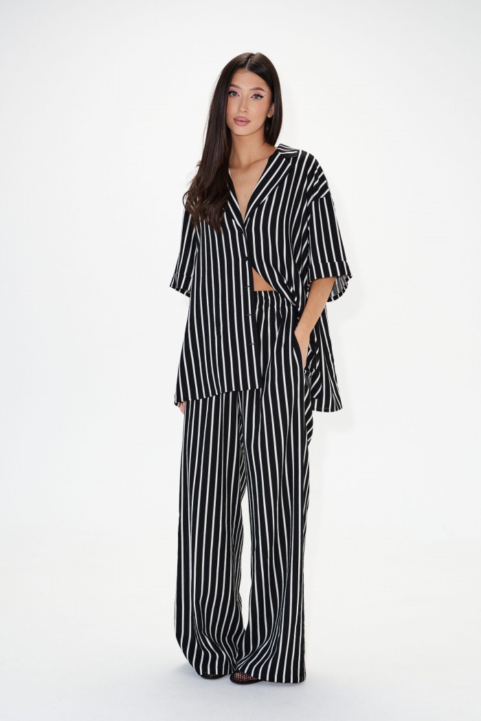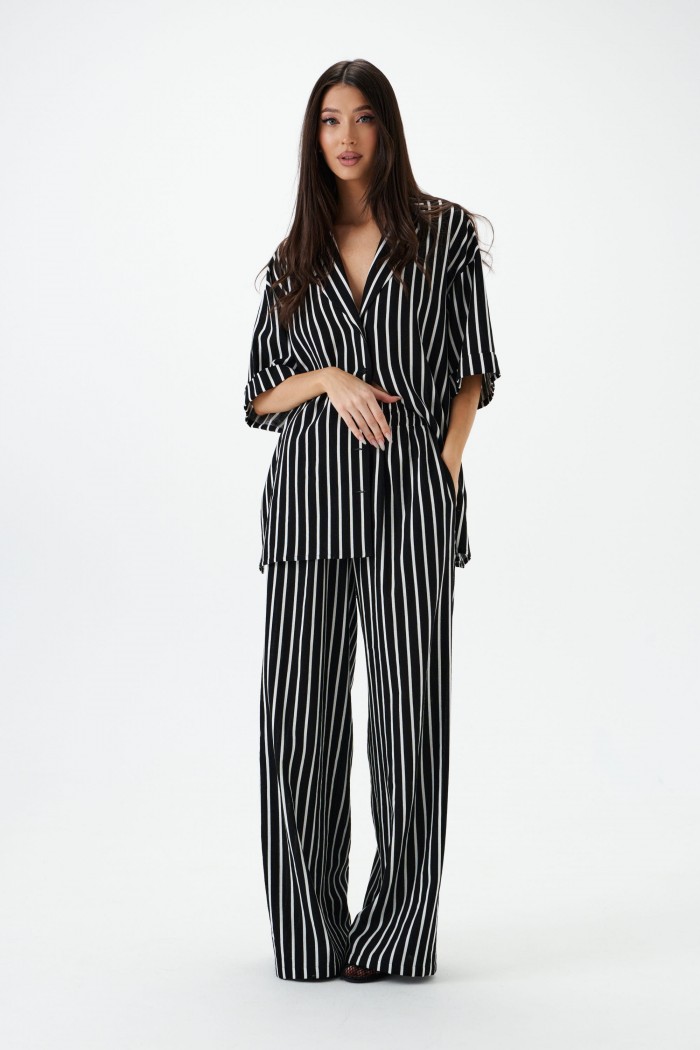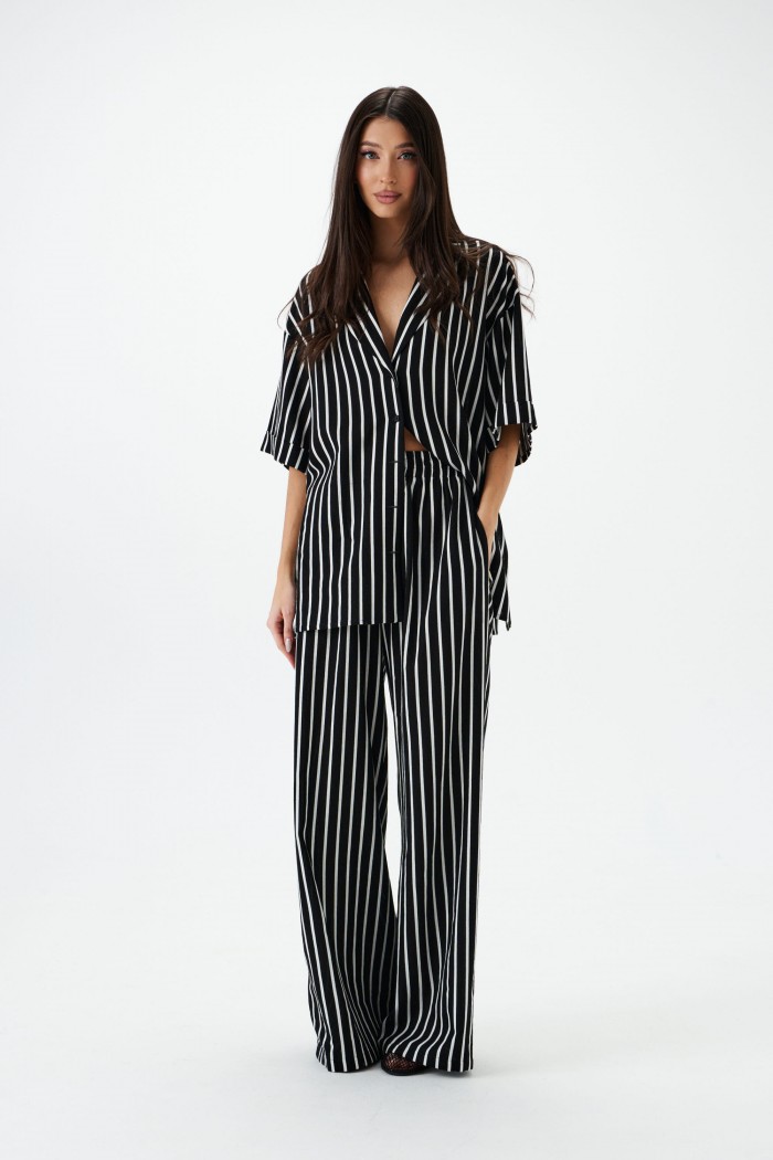 Брюки прямого кроя выполнены из текстильного полотна с принтом вертикальная полоска.