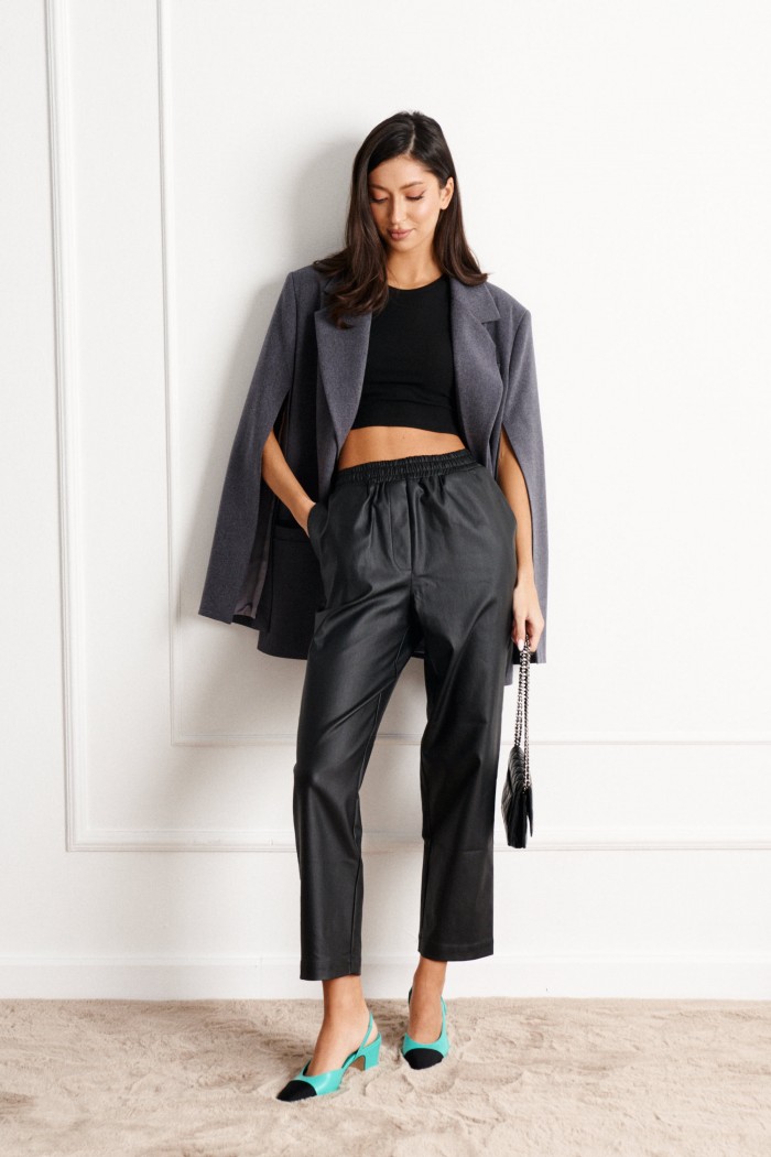 Брюки прямого кроя на резинке выполнены из искусственной кожи.
