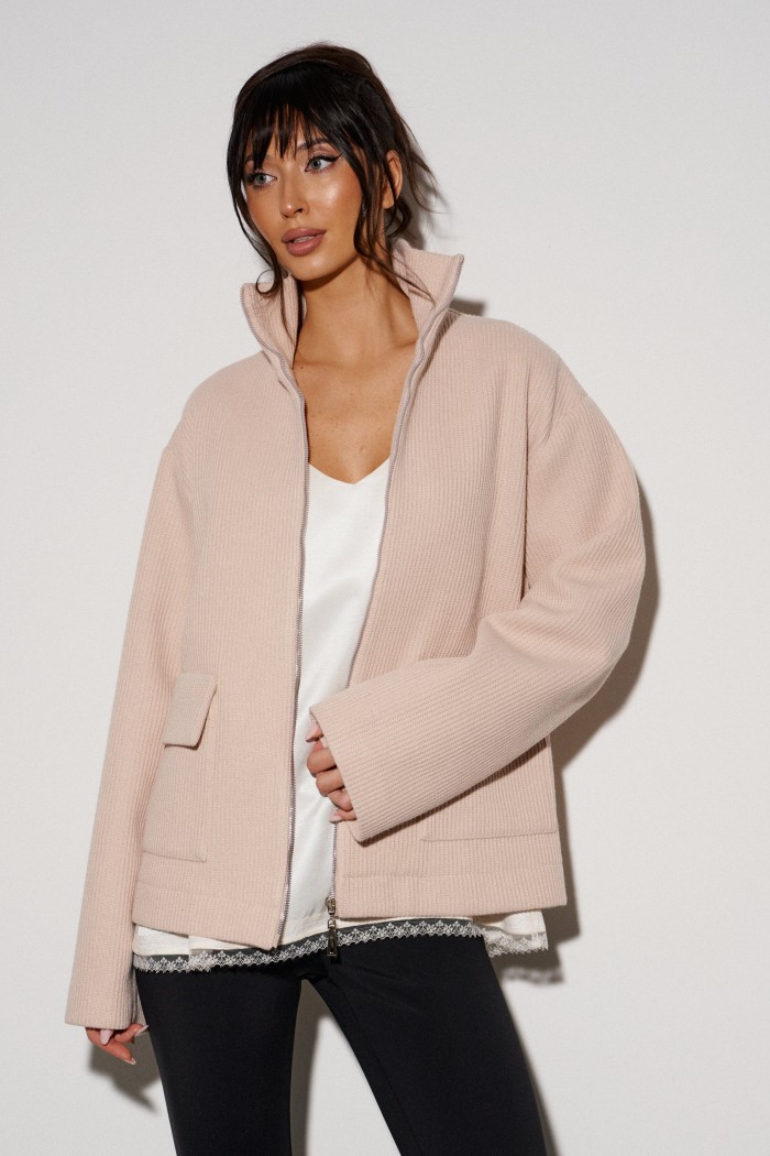 Джемпер прямого кроя, выполнен из трикотажного вязаного полотна бежевого цвета. Характеристики: прямой свободный крой, втачной рукав, немного спущен, горловина стойка, застежка центральная на молнию, брендированная подкладка по рукавам. По переду изделия, на уровне талии, накладные карманы с клапанами.