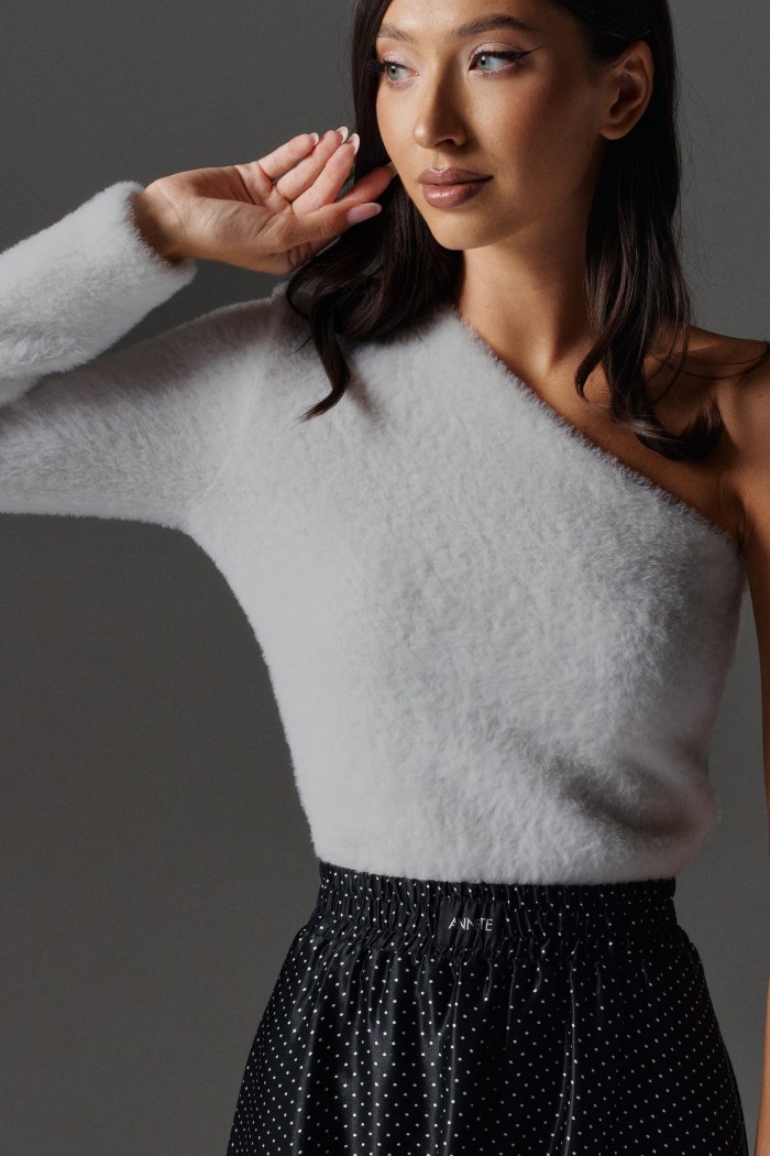 Джемпер прилегающего силуэта с открытым плечом выполнен из мягкого фактурного полотна белого цвета.