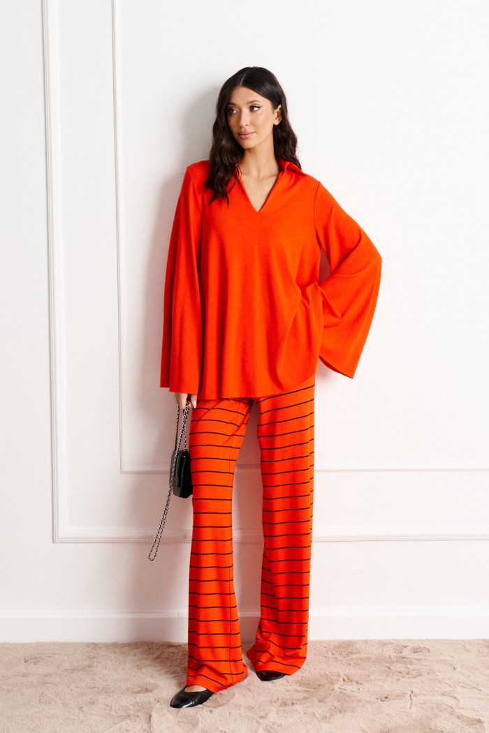 Джемпер прямого кроя выполнен из трикотажного полотна оранжевого цвета.
