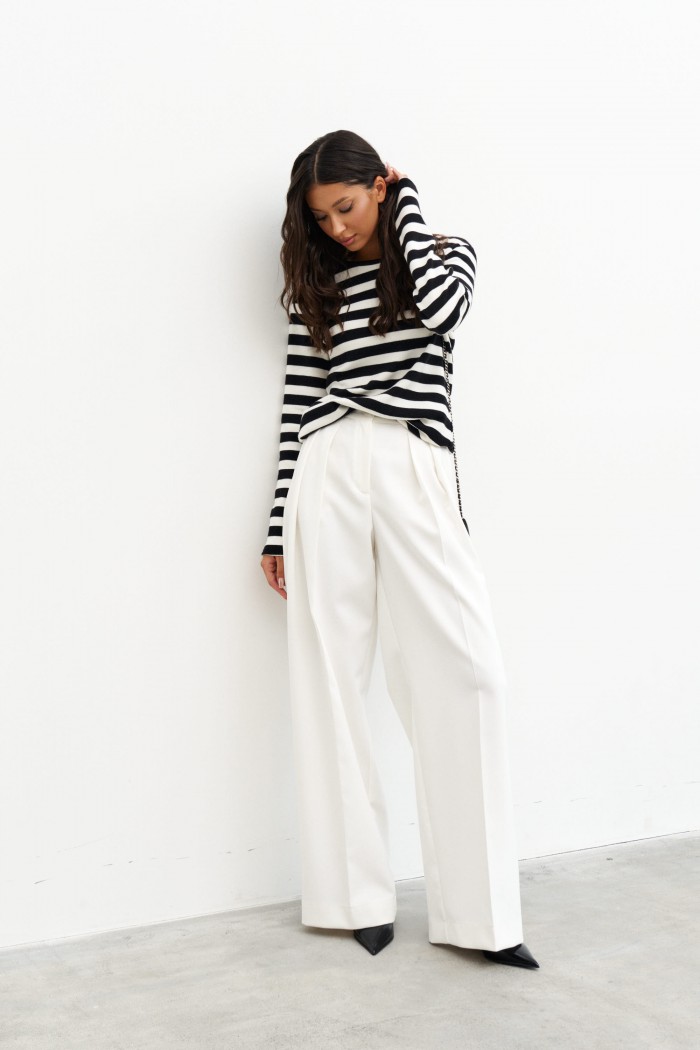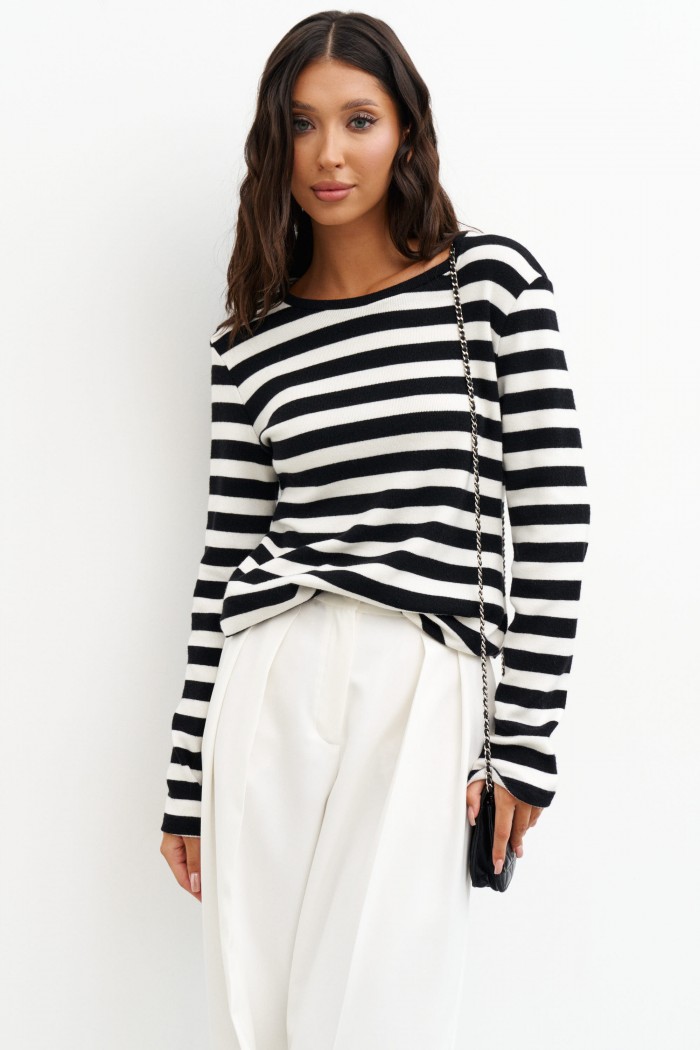 Джемпер выполнен из плотного трикотажного плотна с горизонтальной черно-белой полоской . Характеристики: полуприлегающий силуэт, овальная горловина, рукав втачной. Длина по спинке 57см. Рукав вточной, длина 64см.