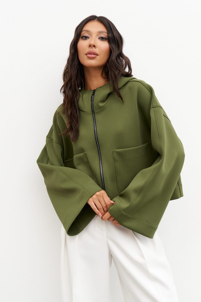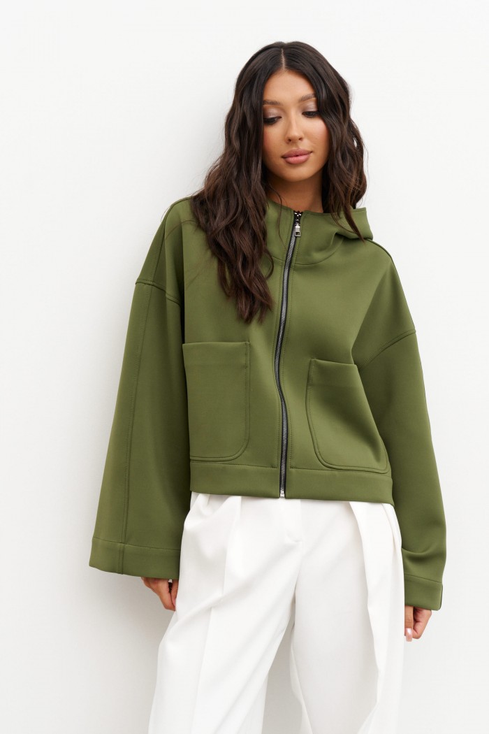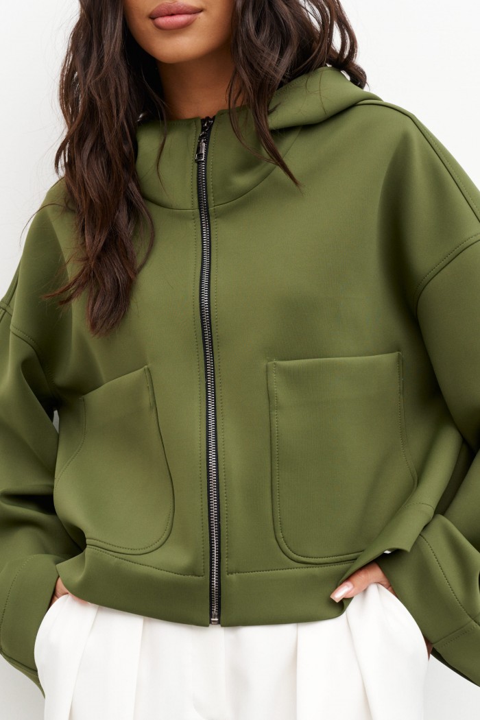 Толстовка с капюшоном. Выполнена из трикотажного полотна зелёного, травянистого цвета. Свободный крой, изделие укороченное, без подклада. Воротник-стойка, переходящий в капюшон. Застёжка: центральная молния. Карманы: накладные функциональные. Рукав: втачной, спущенный, длина 48 см. Длина спинки толстовки 52 см.
