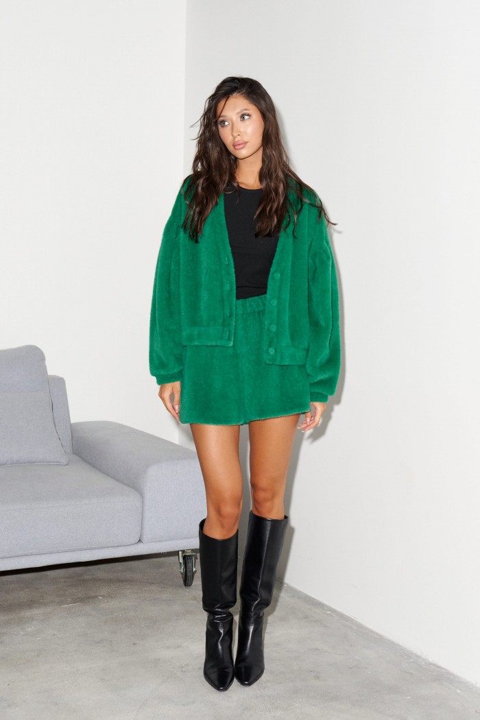 Кардиган свободного кроя выполнен из мягкого фактурного полотна бежевого цвета. Характеристики: свободный крой, горловина V образный вырез, застежка центральная петли пуговицы декорированые тканью основного изделия, рукав объёмный, спущен, по низу рукава манжета. Длина изделия 51 см , длина рукава 71 см от края горловины.