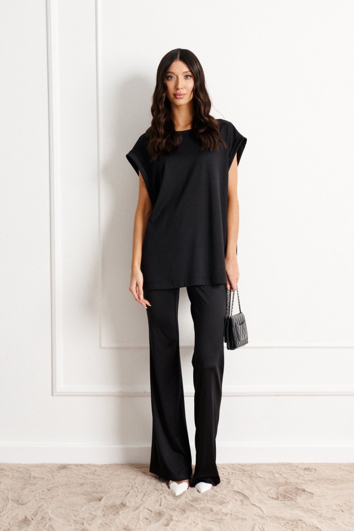 Комплект состоит из джемпера и брюк выполнен из ткани черного цвета.