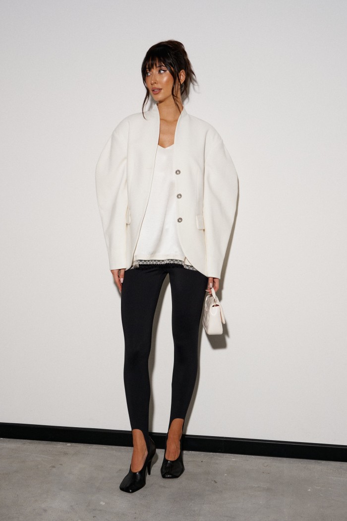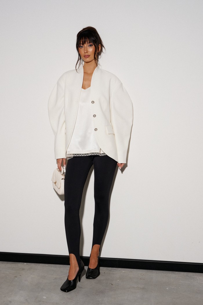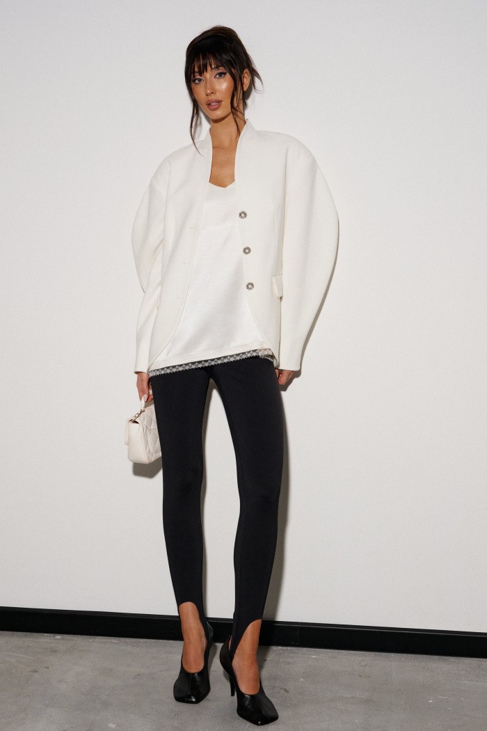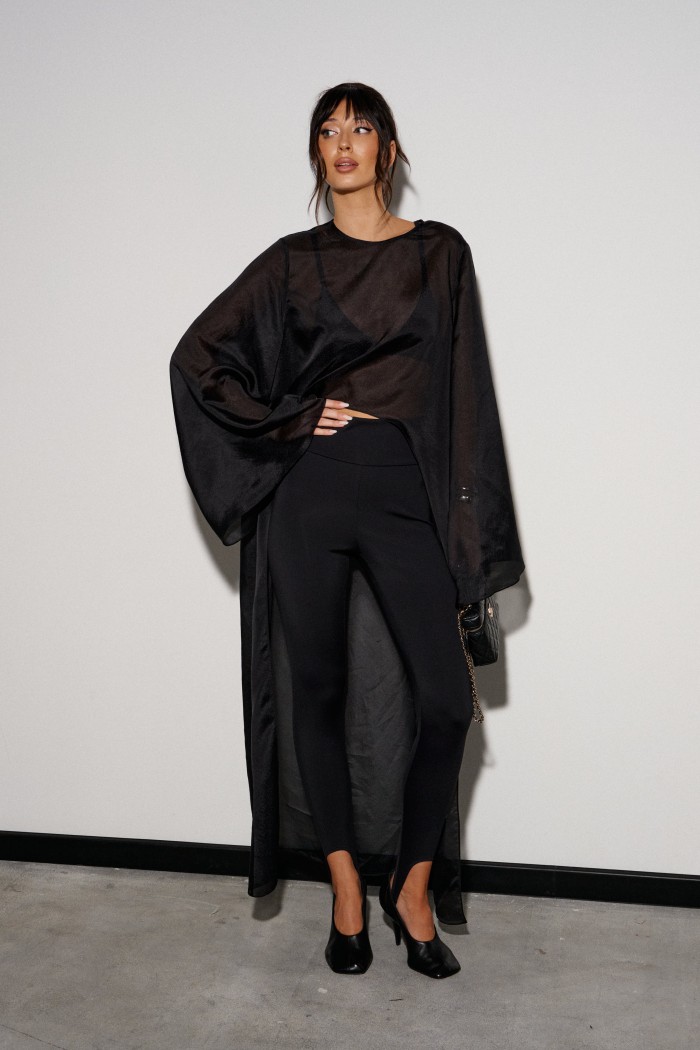 Леггинсы со штрипками выполнены из плотной эластичной ткани чёрного цвета. Характеристики: отрезной широкий пояс из основной ткани, штрипки снизу на резинке. Длина 102см