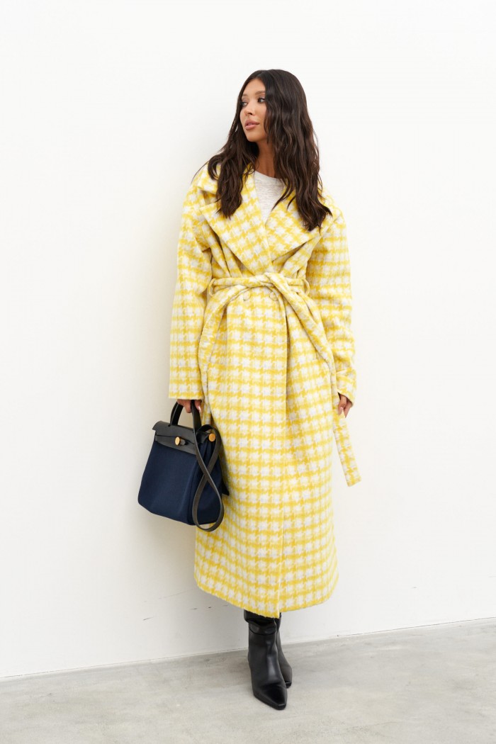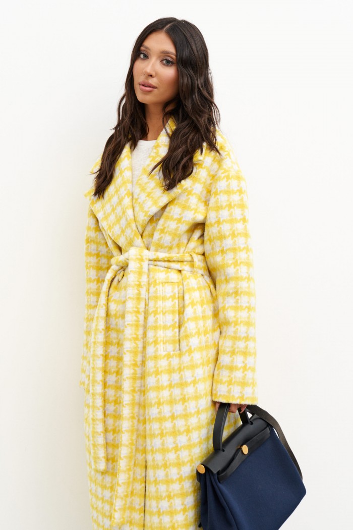 Пальто полуприлегающего силуэта выполнена из твидового полотна желтого цвета с белыми элементами с едва заметной голубой полоской. Характеристики: принт гусиная лапка, полуприлегающий силуэт, подкладка песочного цвета, воротник с крупным остроугольным лацканом, застежка центральная на петли пуговицы, по линии талии шлевки, в комплекте пояс из ткани основного изделия, рукав слегка спущен, в боковых швах карманы. Длина изделия 126, длина рукава 78 от края горловины.