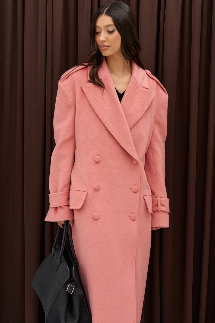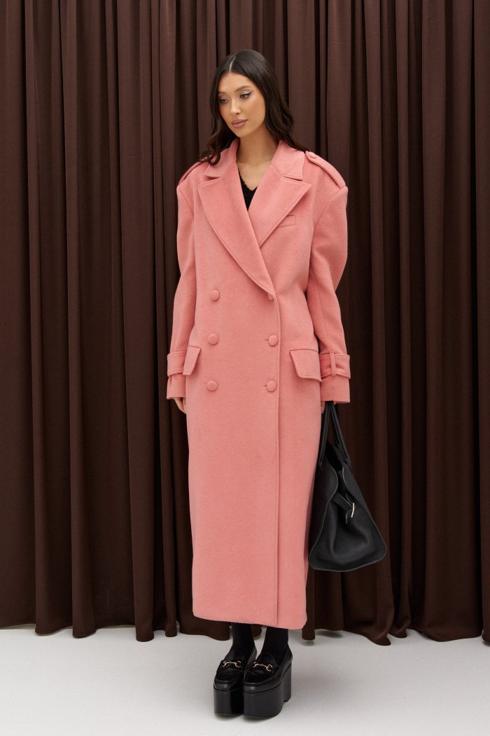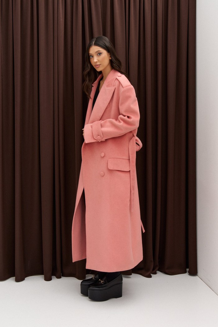 Пальто двубортное. Выполнено из пальтовой ворсовой ткани нежного розового цвета. Есть подклад. Воротник отложной с широкими лацканами. Застежка центральная на петли пуговицы (обтянуты тканью основного изделия). Рукав втачной, немного спущен, есть подплечники, по низу рукава пата с пуговицей.  Длина рукава 61 см. По линии плеча погон с пуговицей. Карман листочка с клапаном. В комплекте пояс из ткани основного изделия. По центру спинки шлица 59 см. Длина спинки 128 см.