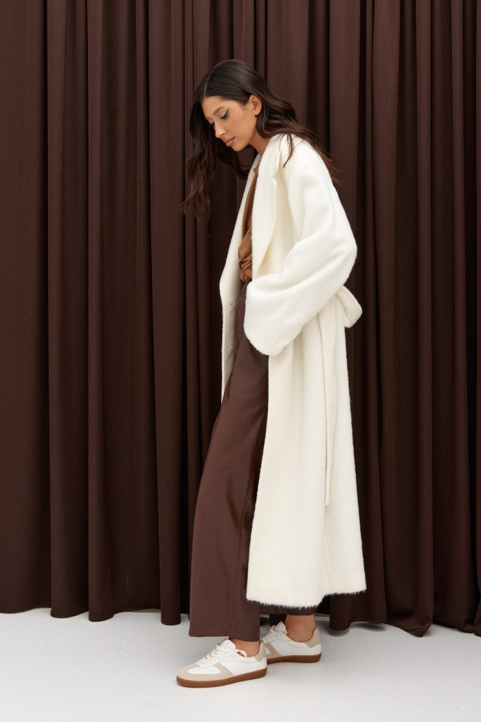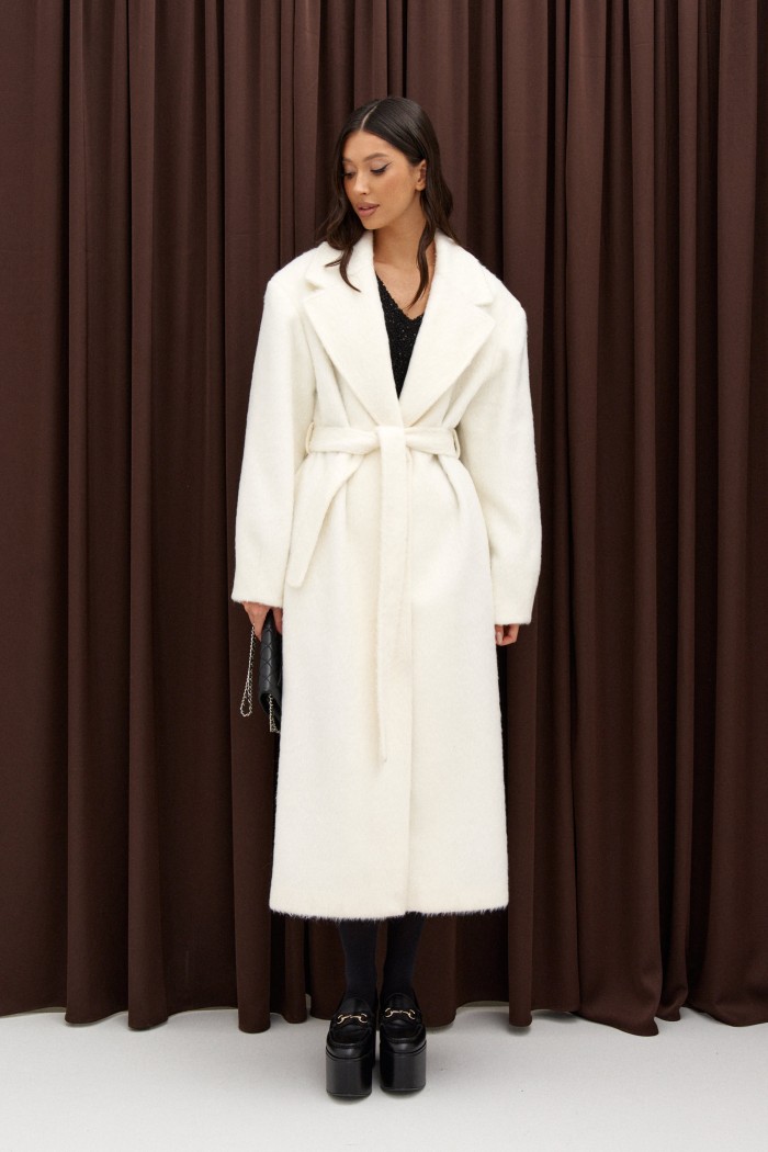 Полупальто прямого кроя выполнено из фактурного полотна молочного цвета. Характеристики: есть подклад, рукав втачной, воротник пиджачного типа, в боковых швах карманы. Спинка со средним шыом заканчивается шлицей, застёжка центральная на петли и пуговицы, пояс выполнен из основной ткани изделия.