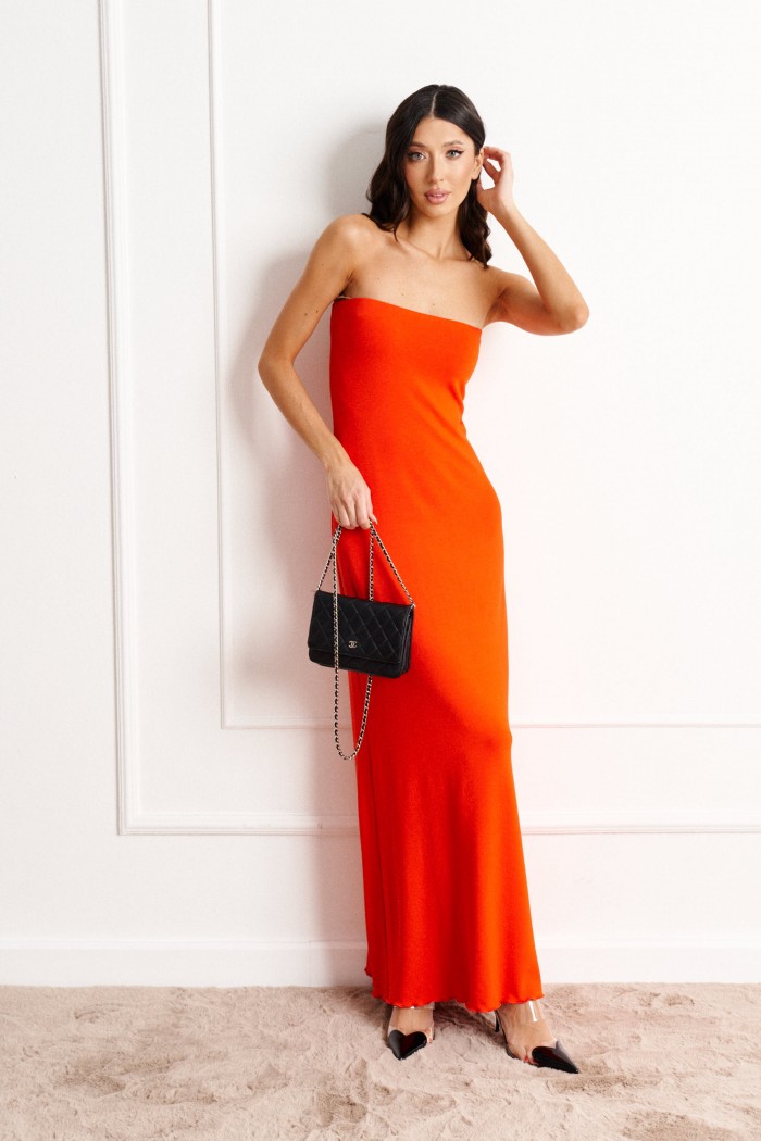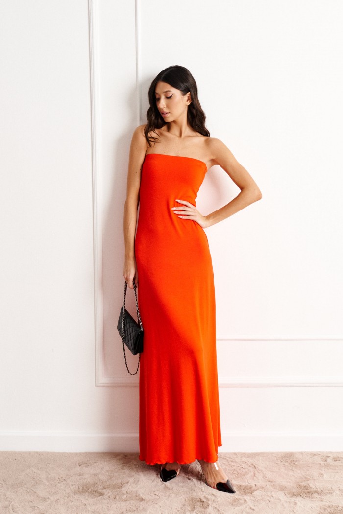 Платье прилегающего силуэта с открытыми плечами выполнено из трикотажного полотна оранжевого цвета.