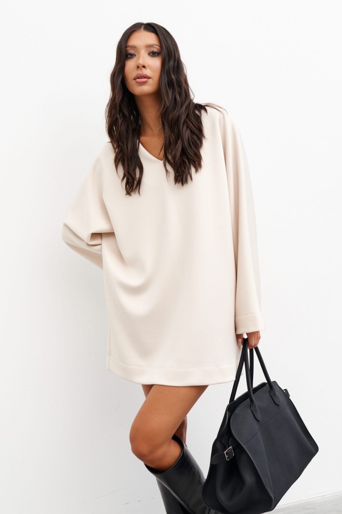 Платье прямого свободного кроя с цельнокроенным рукавом выполнено из ткани бежевого цвета. Характеристики: прямой крой, V образный вырез горловины, рукав свободного кроя цельнокроенный, по спинке средний шов, по низу изделия отделочная строчка. Длина по спинке 77 см, длина рукава от края горловины 74 см.