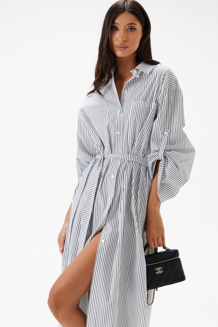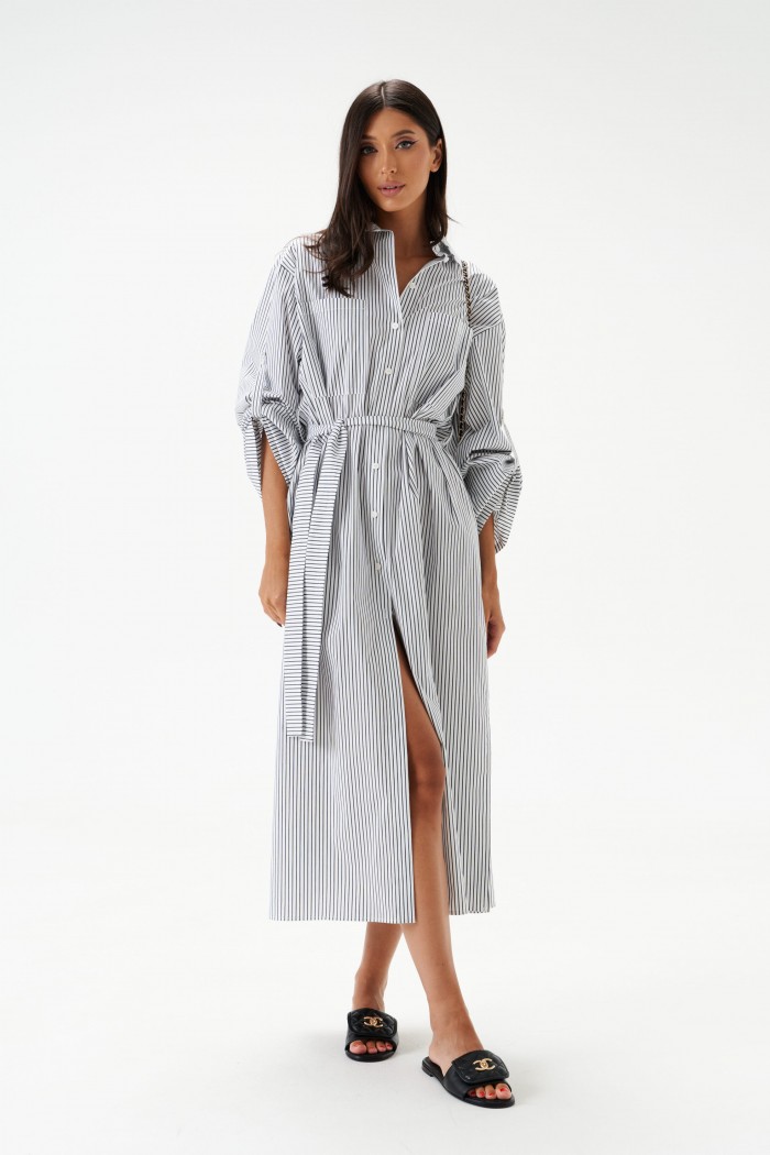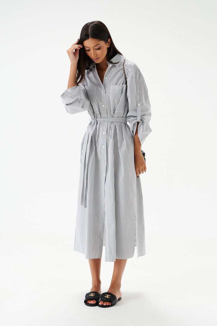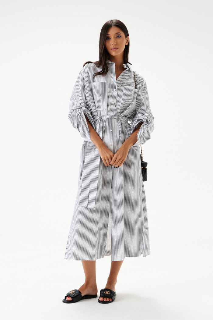 Платье свободного прямого кроя, . Характеристики: отложной воротник, застежка центральная на петли пуговицы, талия фиксируется поясом из основной ткани изделия, по переду нашиты функциаональные карманы. Рукав свободного кроя с пуговичкой по середине и скрытым элементом для удержания рукава при сборке. Спинка отрезная. Длина по спинке 130см.