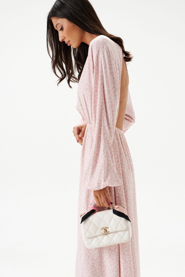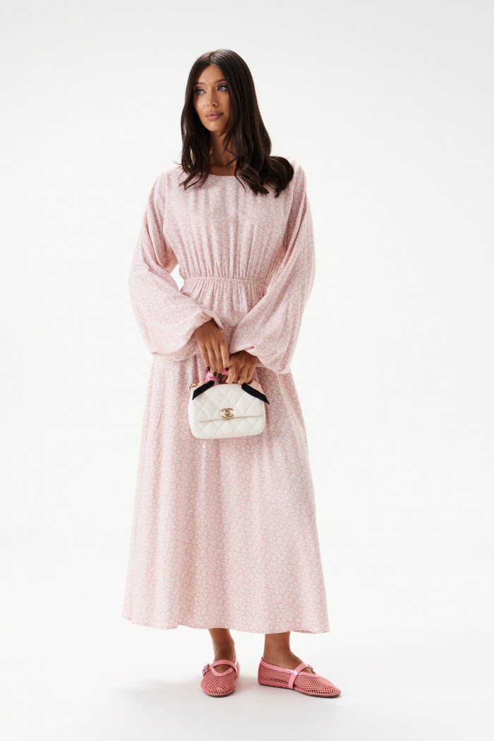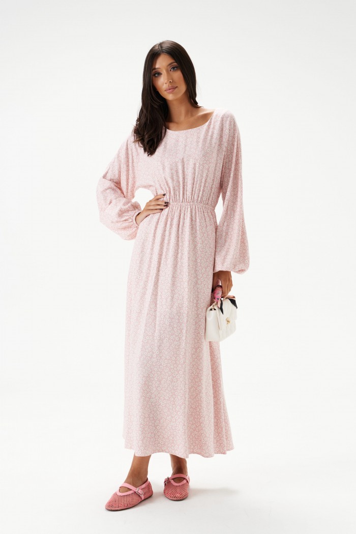 Платье - миди полуприлегающего силуэта выполнено из розового полотна с белым цветочным принтом. Горловина овальная. Отрез ниже талии на резинке. По лифу спинки вырез с завязками. Рукав  спущенный, присборен на резинку. Длина платья 132 см, длина рукава 76 см