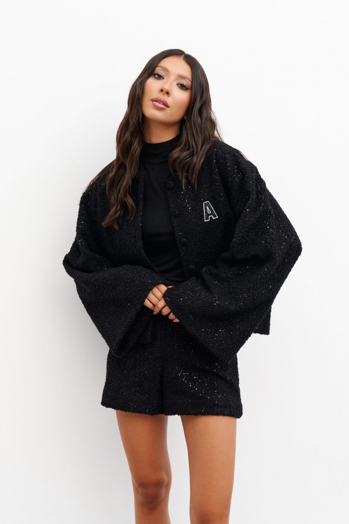 Шорты прямого кроя выполнены из полотна букле черного цвета с пайетками. Характеристики: прямой крой, подкладка, пояс на резинке. Длина по боковому шву 38 см.