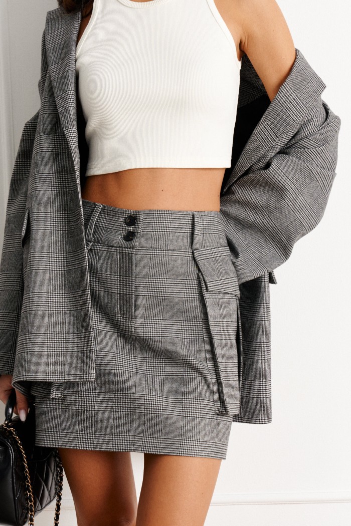 Юбка полуприлегающего силуэта с крупными накладными карманами выполнена из костюмной ткани с геометрическим принтом.
