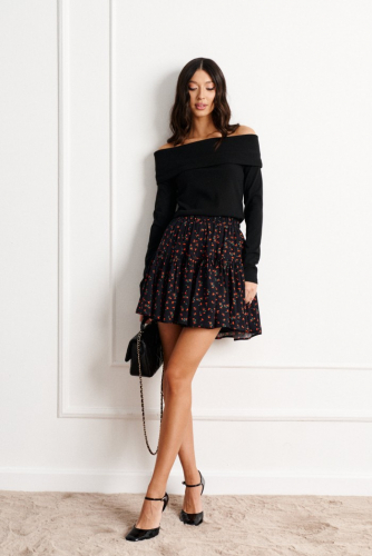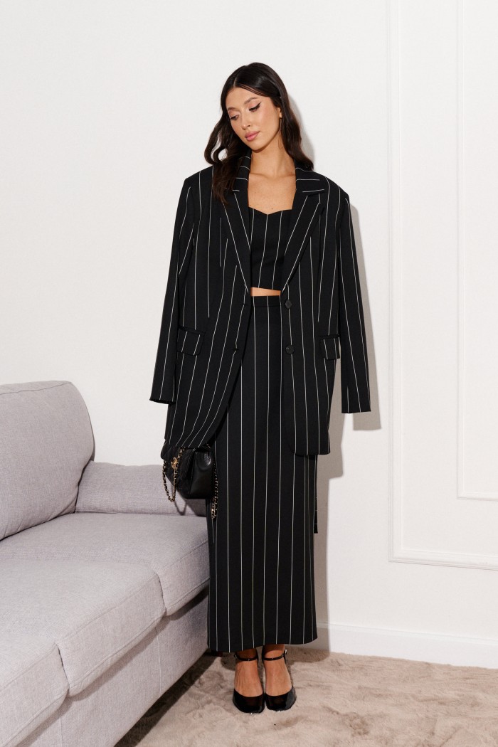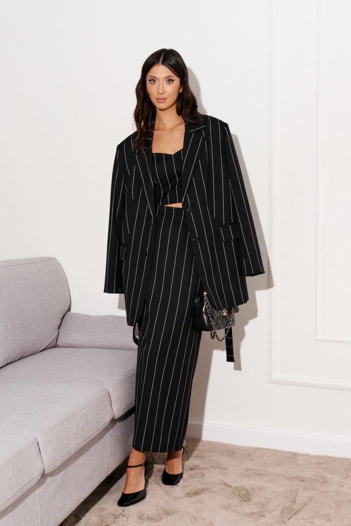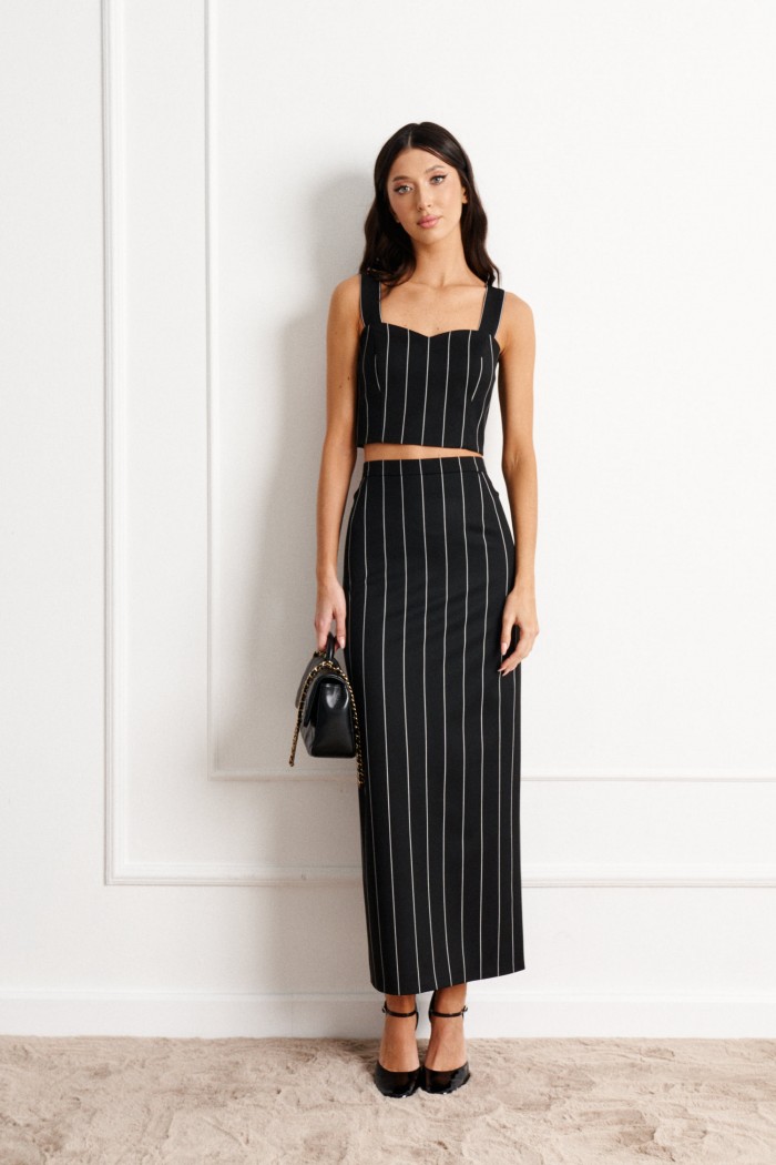 Юбка полуприлегающего силуэта выполнена из черной ткани с принтом белые вертикальные линии.