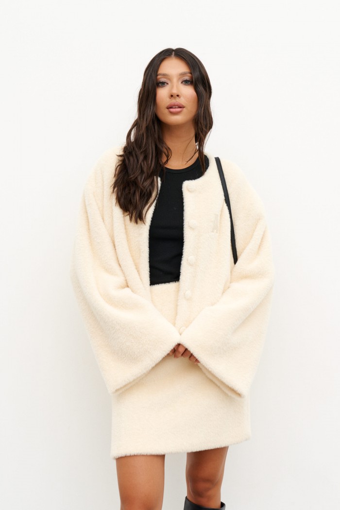 Юбка прямого кроя выполнена из мягкого фактурного полотна бежевого цвета. Характеристики: подкладка, пояс на резинке. Длина юбки 35 см