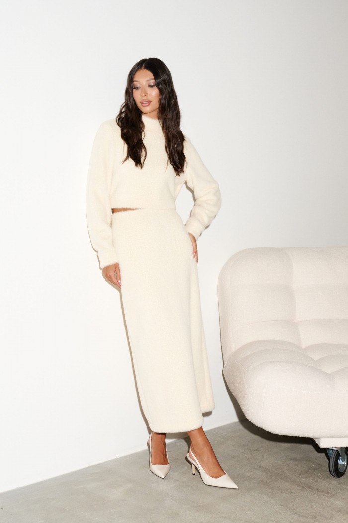 Юбка прямого кроя выполнена из мягкого фактурного полотна бежевого цвета. По задней части изделия разрез 48см. Характеристики: прямой крой, подкладка, пояс на резинке. Длина 85 см.