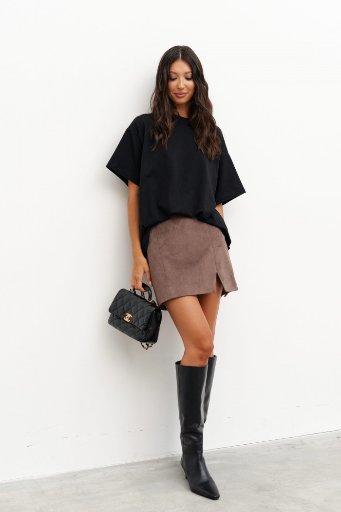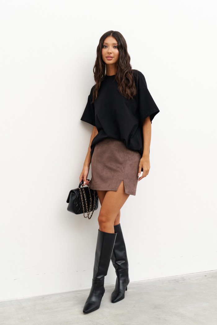 Юбка выполнена из мягкой замшевой ткани цвета шоколад (имитация замши). Характеристики: подкладка, пояс стабильный, по передней части рельефы, левый заканчивается разрезом 8 см. Длина 43 см.