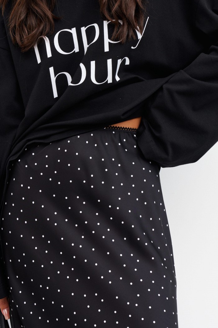 Стильная юбка полуприлегающего силуэта выполнена из струящегося полотна черного цвета в горох. Характеристики: полуприлегающий силуэт, пояс на ожурной резинке. Длина по боковому шву 96 см.