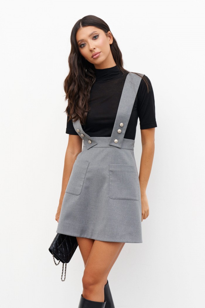 Юбка полуприлегающего силуэта со шлейками выполнена из фактурного полотна серого цвета. Характеристики: полуприлегающий силуэт, подкладка, пояс стабильный, застёжка - потайная молния, по переду два крупных накладных функциональных кармана, по поясу нашиты крупные декоративные пуговицы, шлейки выполнены из ткани основного изделия – не съёмные. Длина юбки 48 см, длина юбки со шлейками 83 см.