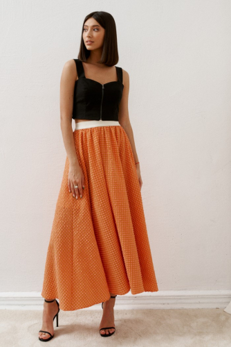 Юбка А образного силуэта длины миди, выполнена из фактурного полотна. Яркая деталь образа, подчеркнет Вашу индивидуальность.
