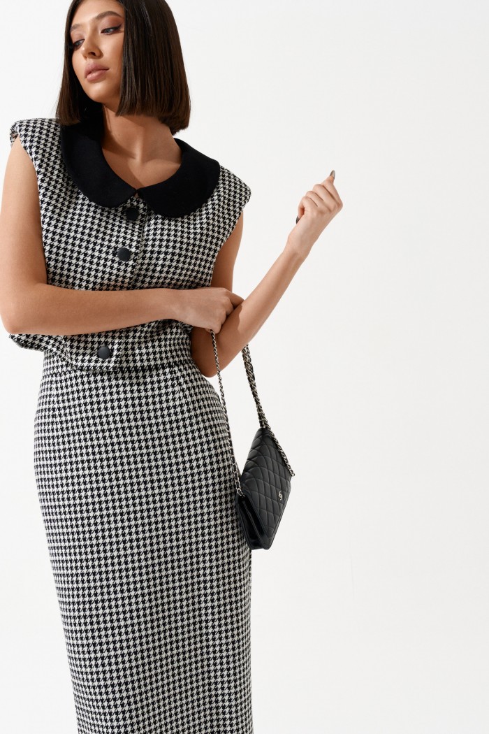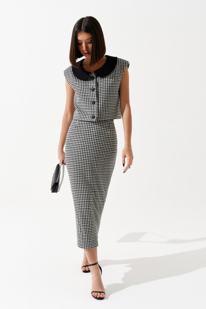 Жилет выполнен из плательной ткани. Характеристики: укороченный, подкладка, подплечники, контрастный воротник, застежка центральная на петли пуговички, спинка цельнокроеная.