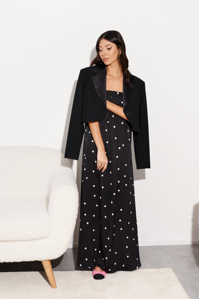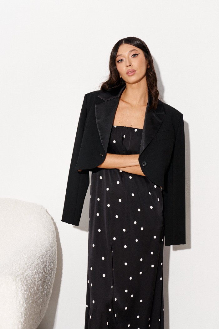 Укороченный жакет с отложным воротником и атласными лацканами.