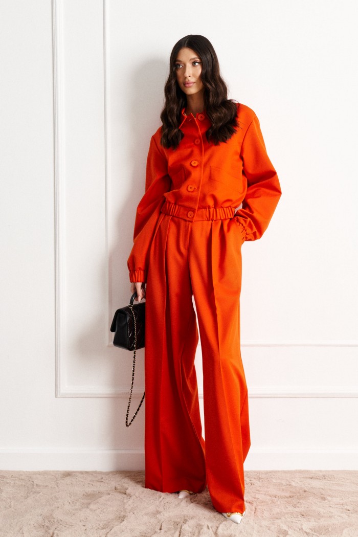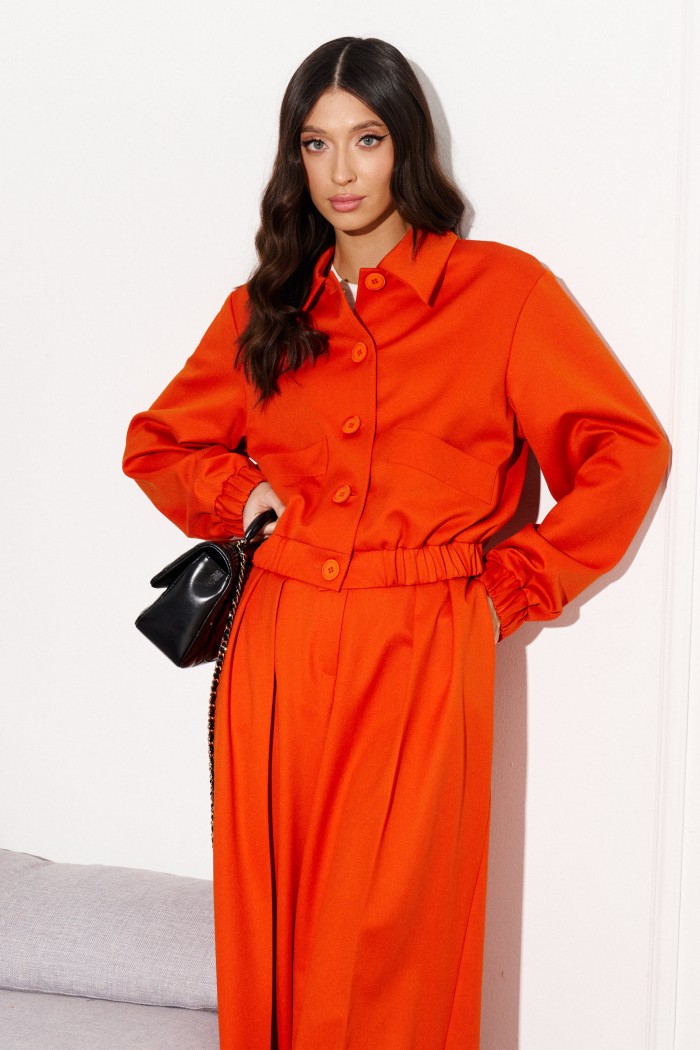 Укороченный жакет выполнен из костюмной ткани оранжевого цвета.