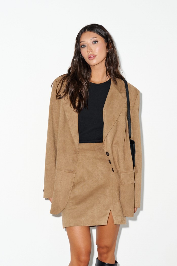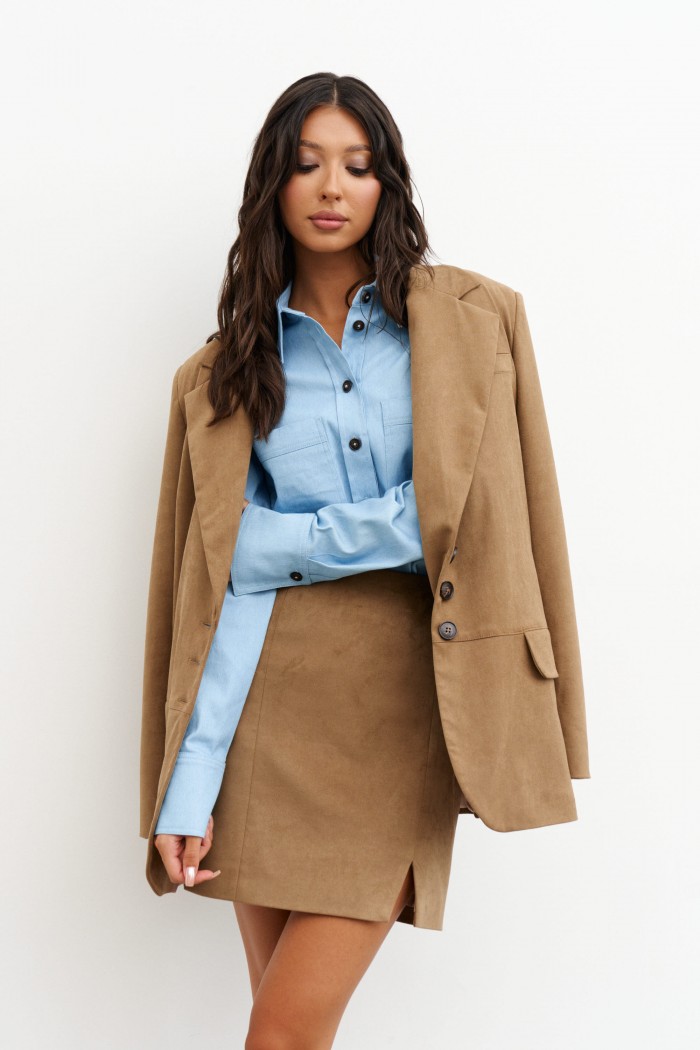 Жакет однобортный. Выполнен из мягкой ткани светло-коричневого цвета (имитация замши). Прямой крой, горизонтальный подрез ниже линии талии, подклад, разреза в спинке нет. Воротник с остроугольным лацканом. Застёжка контрастные петли-пуговицы. Карманы по переду внизу с клапаном без застёжки (функциональные), по груди карман-листочка (нефункциональный). Рукав втачной, на рукваве контрастные петли-пуговицы (нефункциональные), длина 65 см. Длина спинки жакета 77 см.