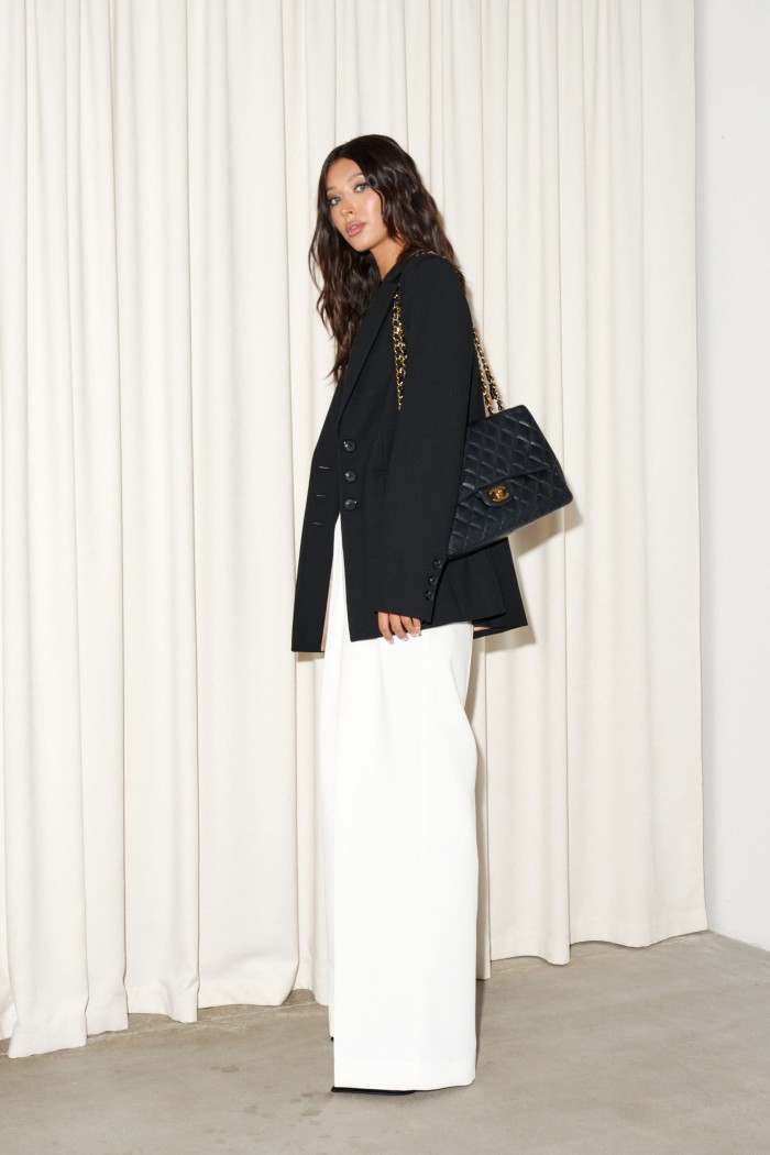 Жакет однобортный. Выполнен из костюмной ткани чёрного цвета. Прилегающий силуэт, подклад, подплечники, талиевые выточки по переду, отрезной бочок, в спинке изделия разреза нет. Вортоник отложной с лацканом. Застежка центральная на петли-пуговички. Карманы по переду внизу (с клапаном) функциональные. Рукав втачной, на рукаве петли-пуговицы (нефункциональнные), длина 66 см. Длина спинки жакета 72 см.