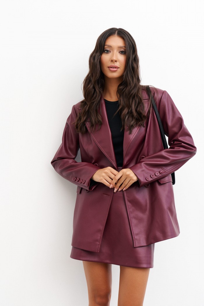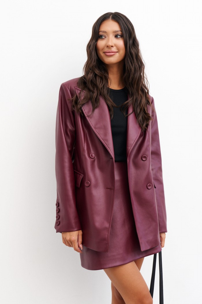 Жакет двубортный. Выполнен из эко-кожи бордового цвета. Полуприлегающий силуэт, подклад, отрезной бочок, приталиевые выточки по передней части, в среднем шве спинки разрез 18 см. Воротник с остроугольным лацканом. Застёжка петли-пуговицы (декорированы тканью основного изделия). Карманы по переду внизу с клапаном без застёжки (функциональные). Рукав втачной, на рукаве петли-пуговицы (нефункциональные, декорированы тканью основного изделия), длина 61 см. Длина спинки жакета 70 см.