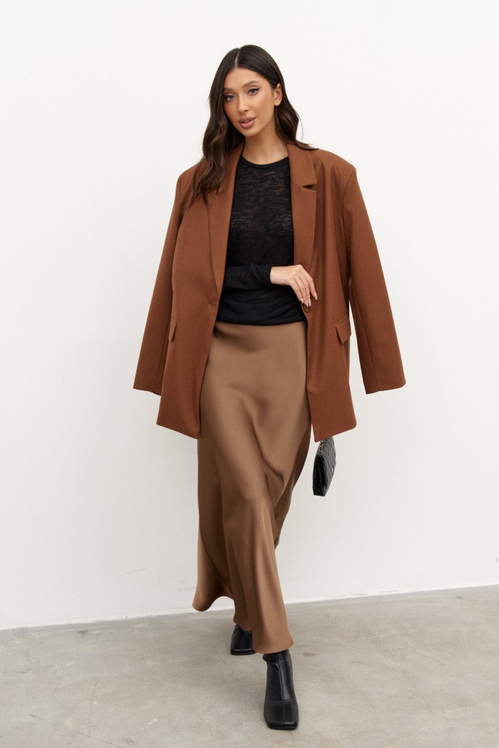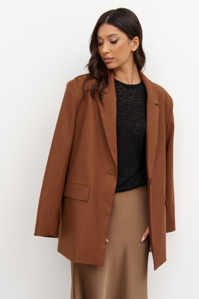 Жакет прямого свободного кроя выполнен из костюмной ткани. Характеристики: прямой свободный крой, подкладка, подплечники, воротник с остроугольным лацканом, застежка центральная на петлю - пуговицу, по переду функциональные карманы с клапаном, рукав втачной, по низу рукава нашиты пуговички, спинка со средним швом, в среднем шве разрез 27 см. Длина по спинке 76, длина рукава 63 см.