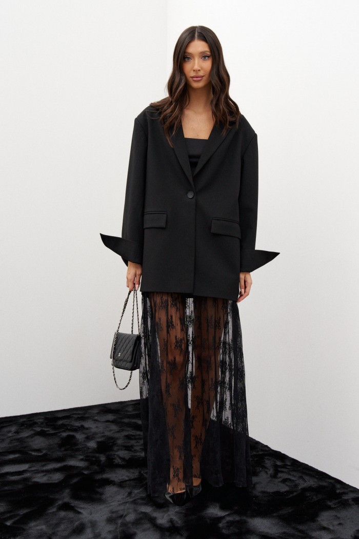 Жакет прямого свободного кроя, выполнен из костюмной ткани черного цвета. Характеристики: широкий прямой крой, отложной воротник с остроугольными лацканами, подкладка, рукав прямой спущеный, по переду изделия карманы в рамку с клапаном, по низу рукава разрез, спинка отрезная с двумя рельефами идущими от плеча до низа, по рельефам шлицы высотой 23 см. Длина по спинке от края горловины 76, длина рукава от края горловины 80 см.