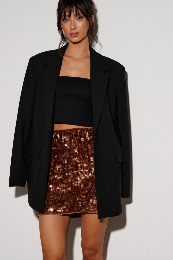 Жакет прямого свободного кроя выполнен из костюмной ткани черного цвета. Характеристики: прямой свободный крой, подкладка, подплечники, воротник с остроугольным лацканом, застежка центральная на петлю - пуговицу, по переду функциональные карманы с клапаном, рукав втачной, по низу рукава нашиты пуговички, спинка со средним швом, в среднем шве разрез 27 см. Длина по спинке 76, длина рукава 63 см.