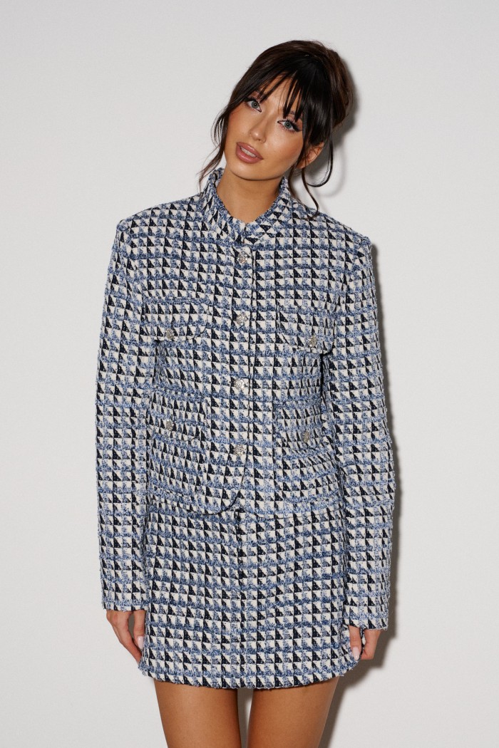Жакет прямого свободного кроя, выполнен из фактурного твидового полотна. Характеристики: горловина стойка, застежка центральнаяна петли пуговицы, подплечники, рукав прямой, внутри брендированная подкладка. На уровне линии груди декоративные карманы с клапаном, внизу накладные карманы с клапаном. Длина по спинке 55 см, длина рукава 65 см.