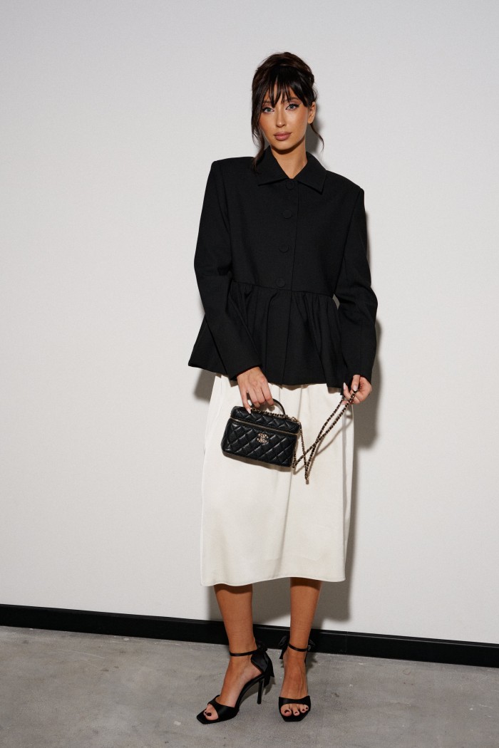 Жакет прямого кроя, с баской по нижней части изделия. Выполнен из костюмной ткани. Характеристики: брендированая подкладка, отложной воротник, застежка центральная на пуговички, рукав втачной. Длина по спинке от края горловины 61 см, длина рукава 83 см.
