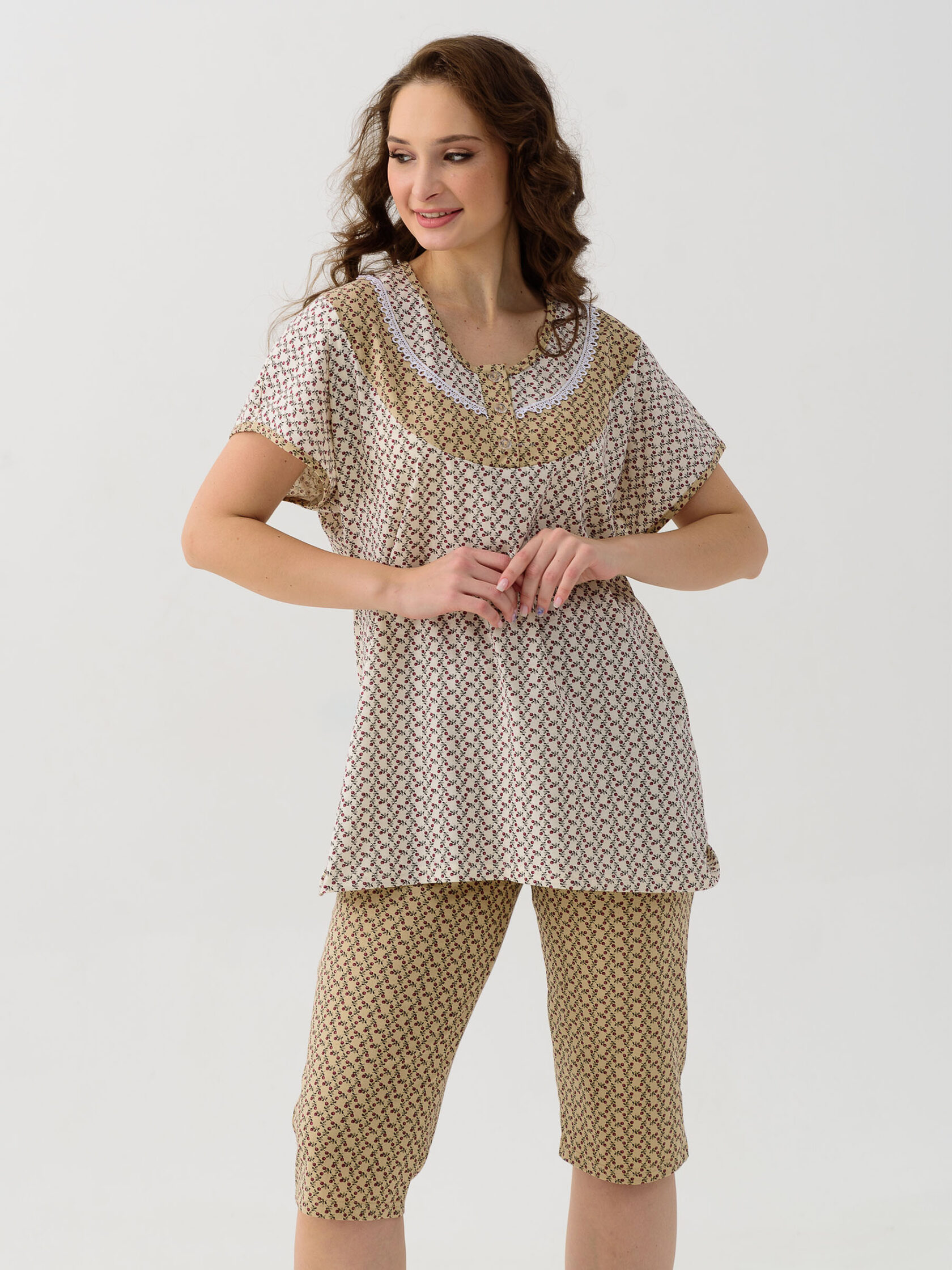 Пижама женская состоит из футболки и бридж. Футболка с круглым вырезом горловины и цельнокроеным рукавом. На полочке фигурная кокетка из отделочного материала отделанная кружевом, на планках с застежкой на кнопки. Горловина и низ рукавов окантованы отделочным материалом. Бриджи прямые из набивного полотна, верх на резинке, низ окантован отделочным материалом. Машинная стирка.