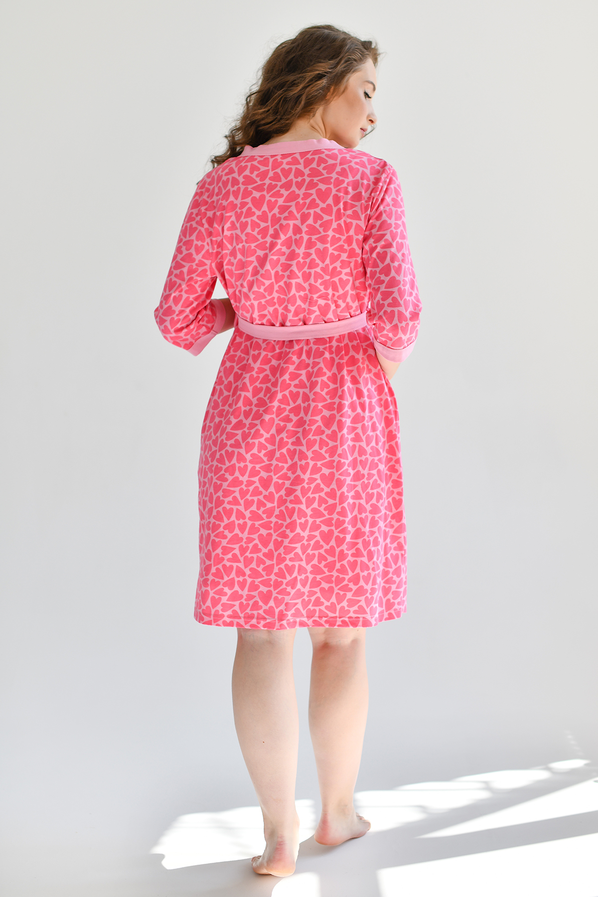 Пеньюар запашной из набивного полотна с втачным рукавом длиной ¾. В боковых швах карманы. Борта и низ рукавов окантованы полотном-компаньоном.