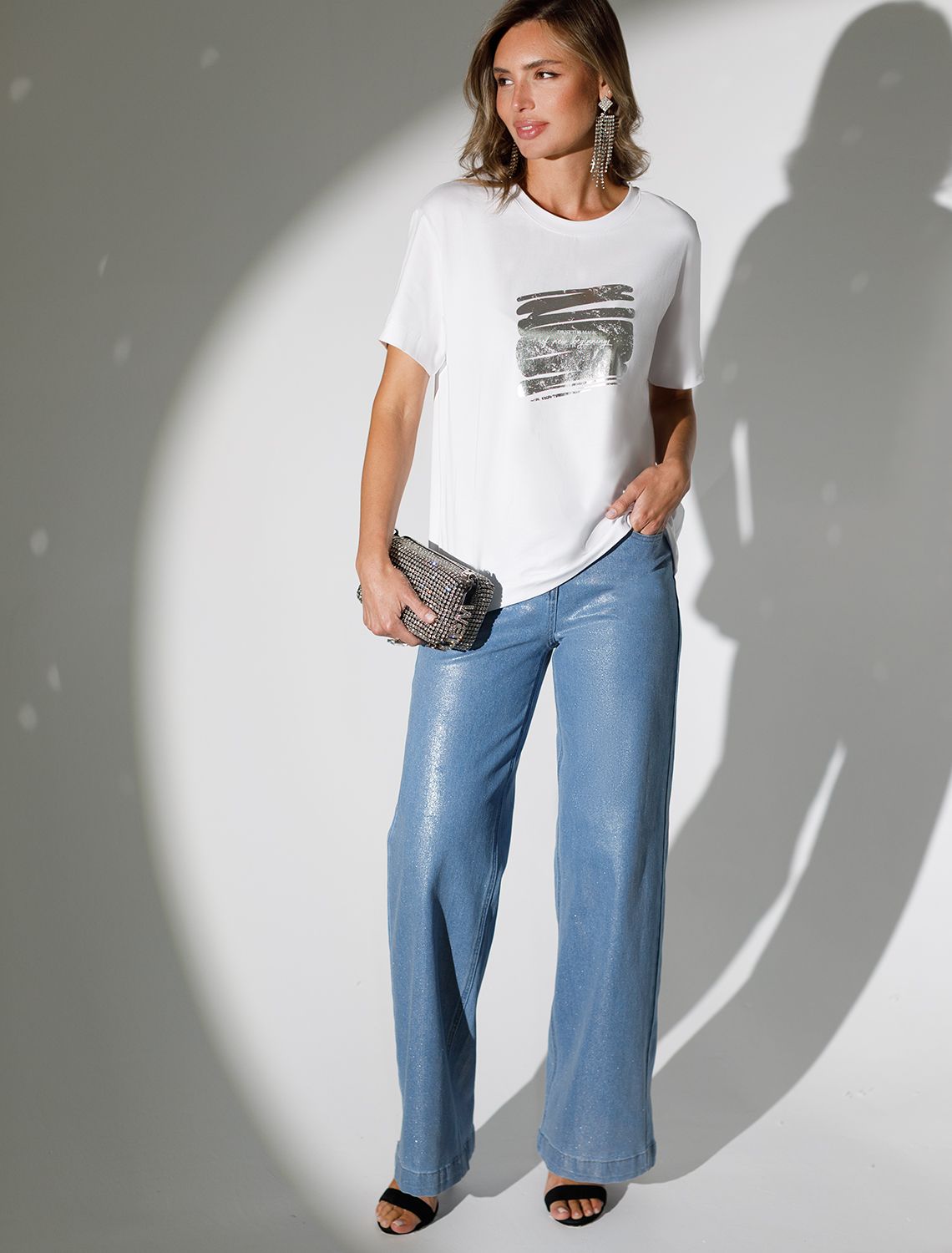 Стильная базовая футболка белого цвета с серебристым принтом фольгой выполнена из плотного хлопка с эластаном для комфортной посадки на любую фигуру. Прямая футболка классического кроя с круглым вырезом, прекрасно подходит для разных типов фигуры, в том числе и на большие размеры. Мягкость хлопка вместе с небольшой долей эластана гарантирует идеальную посадку и свободу движений. Легкая натуральная дышащая ткань премиального качества делает футболку с коротким рукавом идеальным вариантом для повседневной носки дома, на работу или офис. Однотонная футболка дополнена авторским аккуратным принтом с минималистичной надписью, который придает праздничный и элегантный вид без лишней вычурности. Блестящий принт аккуратно украшает, добавляя изысканный акцент и создавая легкий мерцающий эффект. Перевод надписи Trust the magic of new beginnings - Доверьтесь магии новых начинаний.